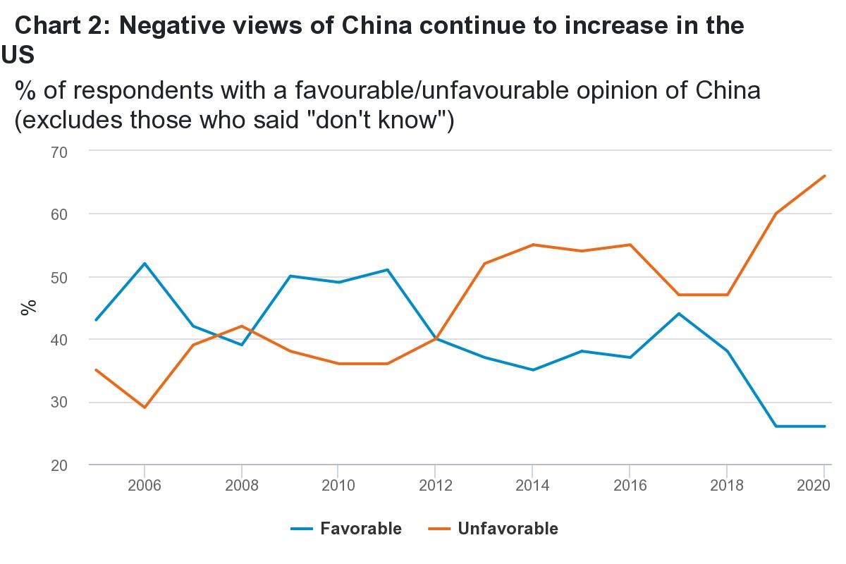 Zdá se, že se jedná o strategii, která zatím funguje, protože negativní názory na Čínu v USA stále sílí. Vypadá to, že vztahy mezi dvěma největšími ekonomikami světa se ve střednědobém horizontu budou zhoršovat.