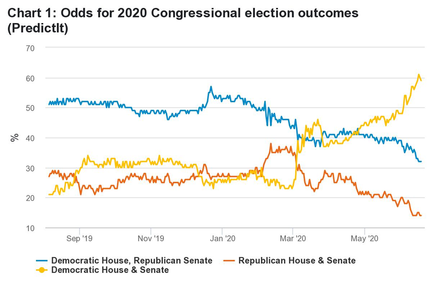 Rychlost a hloubka recese nastupující po Covidu úplně převrací Trumpovu původní strategii, při které stavěl kampaň na velmi silné ekonomice. Naneštěstí pro Trumpa, žádný úřadující prezident kromě Calvina Coolidge v roce 1924 nevyhrál znovu volby, pokud byla v průběhu 24 měsíců předcházejících volbám recese. Jestliže se změní prezident, je pravděpodobné, že se moc otočí i v Senátu, což umožní demokratům kontrolovat jak exekutivní, tak legislativní větev vlády.