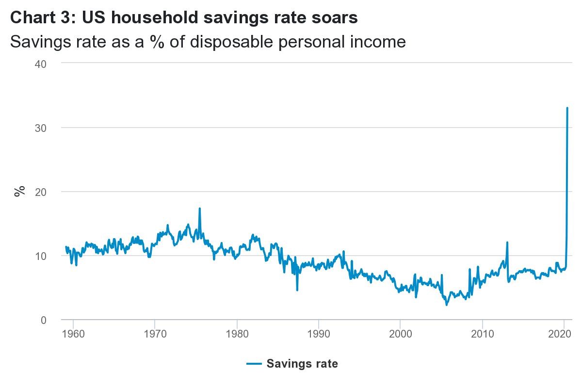 Trump ví, že pouhé obviňování Číny nebude stačit k jeho znovuzvolení, a proto také potřebuje, aby se ekonomika do listopadu silně nastartovala. To je hlavní důvod, proč se jeho administrativa rozhodla znovu otevřít velkou část ekonomiky, aniž by čekala na jasnější známky ústupu epidemie, což byl předpoklad pro uvolnění na mnoha jiných místech v Asii i v Evropě. Tento krok znamená, že se americká ekonomika v krátkodobém horizontu zotaví rychleji, ale současně se zvyšuje riziko druhé nebo třetí vlny nemoci. Prezident dostává od FEDu obrovskou pomoc. FED se zavázal k nekonvenčním politikám, jako jsou helikoptérové peníze a „nekonečné kvantitativní uvolňování", aby monetizoval dluh. Také naznačil, že plánuje udržet sazby na nule až do roku 2022, a zdá se, že upřednostňuje zotavení pracovního trhu před riziky nadměrného růstu cen aktiv. Výjimečná opatření Kongresu znamenají otevření fiskálních kohoutků jako nikdy předtím, protože někteří pracovníci dostávají dávky v nezaměstnanosti dokonce vyšší než mzdy, které by dostali, kdyby se vrátili do práce. V důsledku toho míra úspor domácností vzrostla nad 30 procent, což je nejvyšší hodnota za posledních 60 let. Počáteční signály z ekonomiky jsou slibné, ale výhled je nejasný.