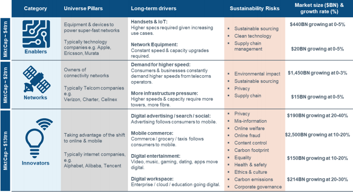 Portfolio manažeři Fidelity International téma rozdělili na tři oblasti: Aktivátoři, Síť a Inovátoři. Každá oblast přitom má své ekonomické a investiční charakteristiky. „Rozjížděči", nebo řekněme aktivátoři, jsou společnosti, které poskytují vybavení, zařízení a komponenty potřebné pro fungování vysokorychlostních sítí - například Ericsson, jenž vyrábí komunikační zařízení. Nejčastěji se nachází v technologickém sektoru. V druhé oblasti jsou firmy, které vlastní nebo provozují, typicky telekomunikační společnosti. Příkladem mohou být americké firmy Verizon a Charter nebo evropská Cellnex. Třetí a poslední skupina jsou inovátoři, tedy společnosti těžící z výhod a příležitostí v oblasti konektivity, a nabízejí produkty a služby zákazníkům a uživatelům. Jedná se typicky o internetové firmy zabývající se novými médii a herní společnosti, jako Alphabet, Alibaba a Tencent. To, co již dlouhodobě stimuluje inovace je digitální reklama, mobilní obchod a digitální zábava.