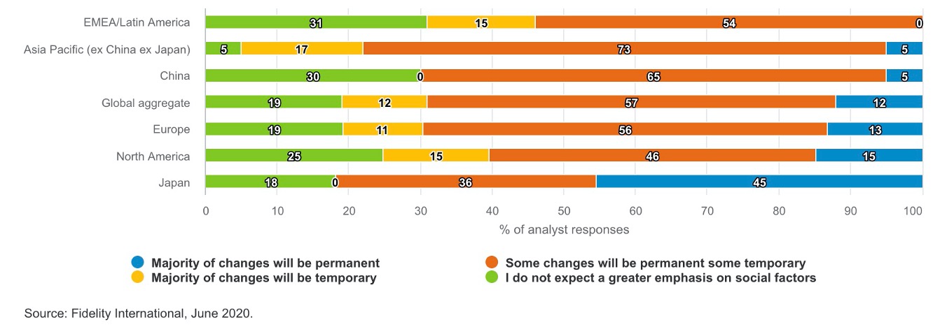 Tuto transformaci smýšlení firem dokázala Fidelity International vyhodnotit prostřednictvím vlastního průzkumu mezi více než 140 analytiky po celém světě. Více než polovina respondentů průzkumu naznačila, že v důsledku pandemie se společnosti při plánovaní více zaměřily na zaměstnance, spotřebitele a širší komunitu.