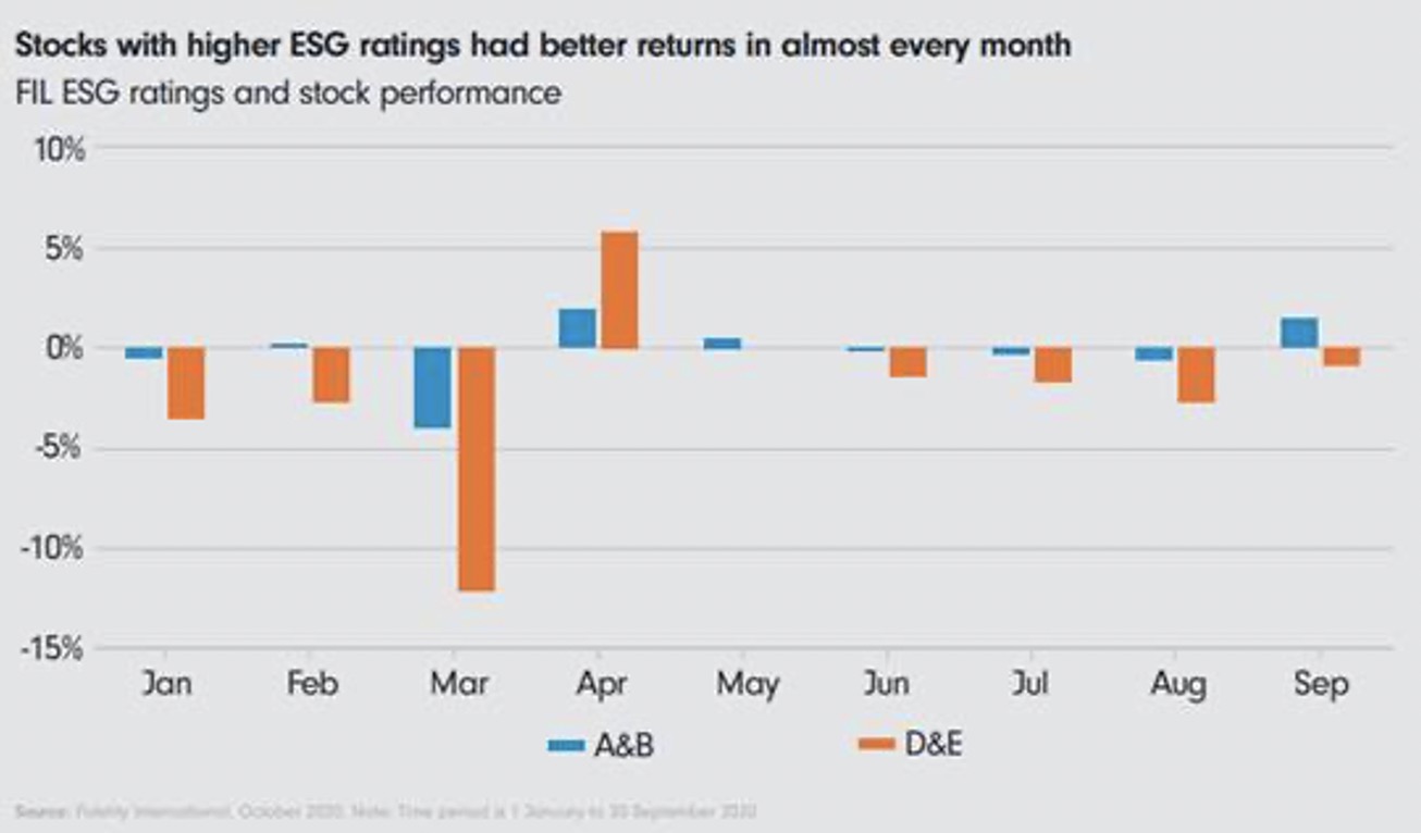 Podle Fidelity International akcie s vyšším ESG ratingem překonaly během prvních devíti měsíců roku 2020 ty s nižším ESG ratingem. Tedy v turbulentním období těžce poznamenaném pandemií Covid-19, a to v každém měsíci od ledna do září, s jedinou výjimkou v dubnu.