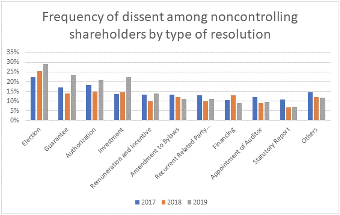 Další významnou změnou je zvyšující se podíl akcionářů, kteří hlasují proti rozhodnutím, která se jim nelíbí, namísto tichého smíření se s nimi. Počet rozhodnutí, která obdržela více jak 10 procent hlasů „proti", se v loňském roce zvýšil na 385, což je nárůst přibližně o 20 procent oproti roku 2017. Mezi rozhodnutími, která zaznamenala největší odpor, byly volby do představenstev, garance u půjček a transakce mezi spřízněnými stranami.