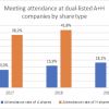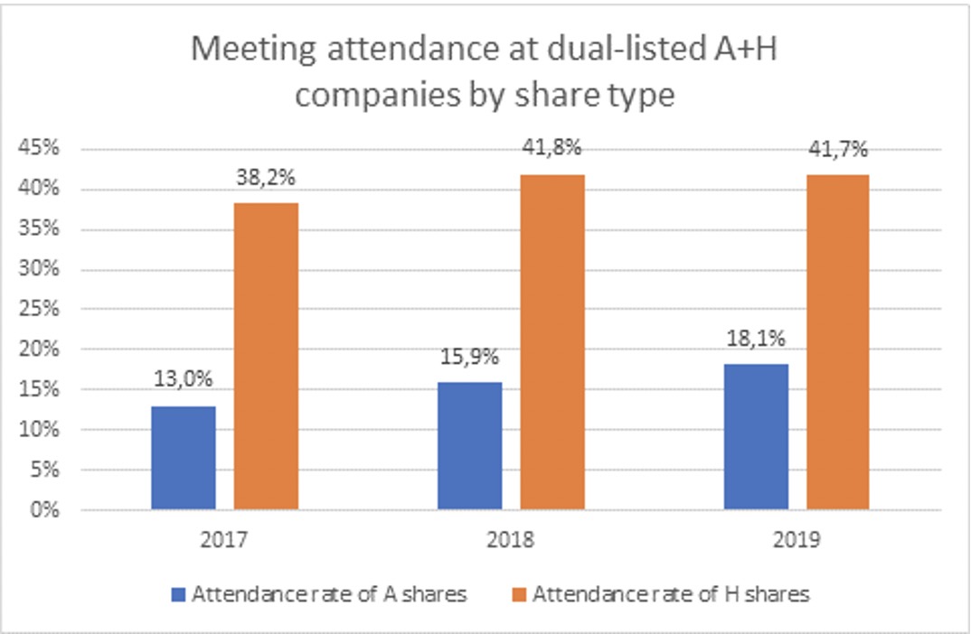 Z čínských společností, které participovaly na průzkumu, je více než 100 společností s akciemi typu A a kótovaných v rámci kontinentální Číny (Šanghaji a Šenčenu), a také označovaných jako H v Hongkongu. Při pohledu na hlasovací praktiky u společností typu A+H se ukazuje prostor pro zlepšení pro čínské kontinentální investory. Zejména proto, že hongkongský trh je méně orientovaný na maloobchod a majitelé H podílů se při hlasování zdají být aktivnějšími.