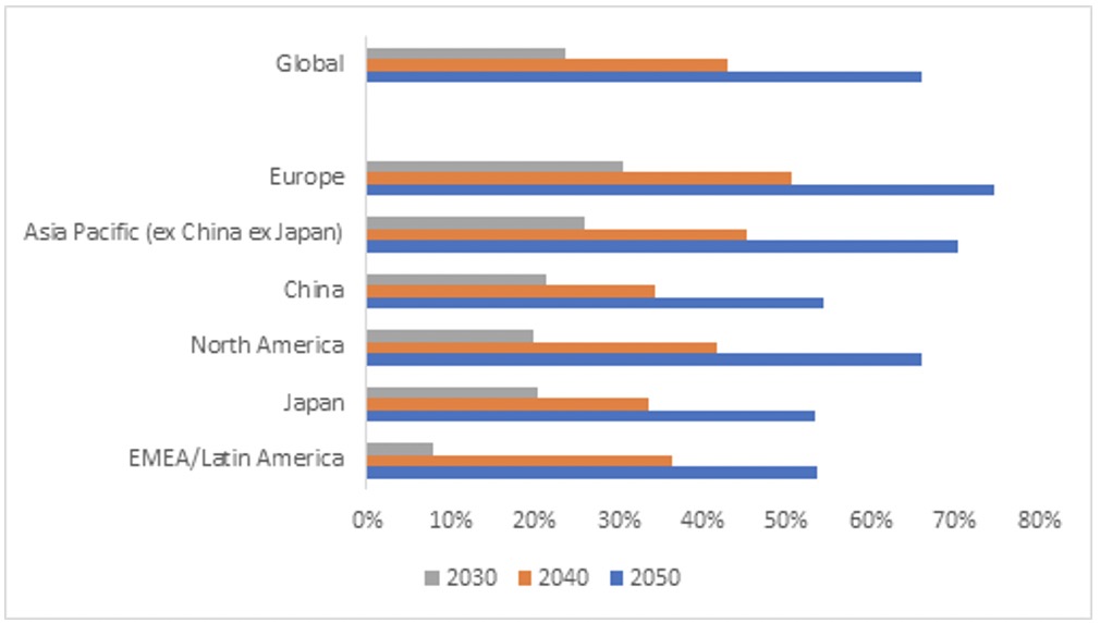 Podle každoročního Průzkumu analytiků Fidelity International, který se věnuje otázkám ESG v řadě průmyslových odvětví a napříč regiony, bude téměř čtvrtina (24 %) všech společností do konce tohoto desetiletí uhlíkově neutrální. Evropské společnosti jsou v této záležitosti výrazně napřed, přičemž analytici odhadují, že až 30 % z nich bude uhlíkově neutrální do roku 2030.