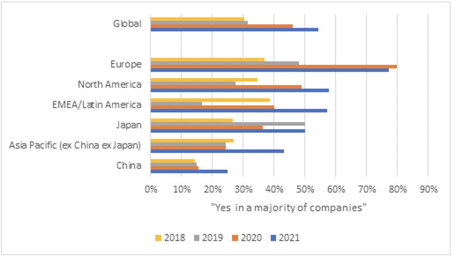 Těší nás, když pozorujeme, že problematika udržitelnosti každoročně stoupá na důležitosti v agendách firem i napříč region. Značí to změnu uvažování, která byla zrychlena pandemií. Letos tak poprvé více než polovina (54 %) analytiků Fidelity uvádí, že většina jimi pokrývaných společností už pravidelně diskutuje o otázkách udržitelnosti. V roce 2020 to bylo 46 procent a v roce 2017 pouhých 13 procent.