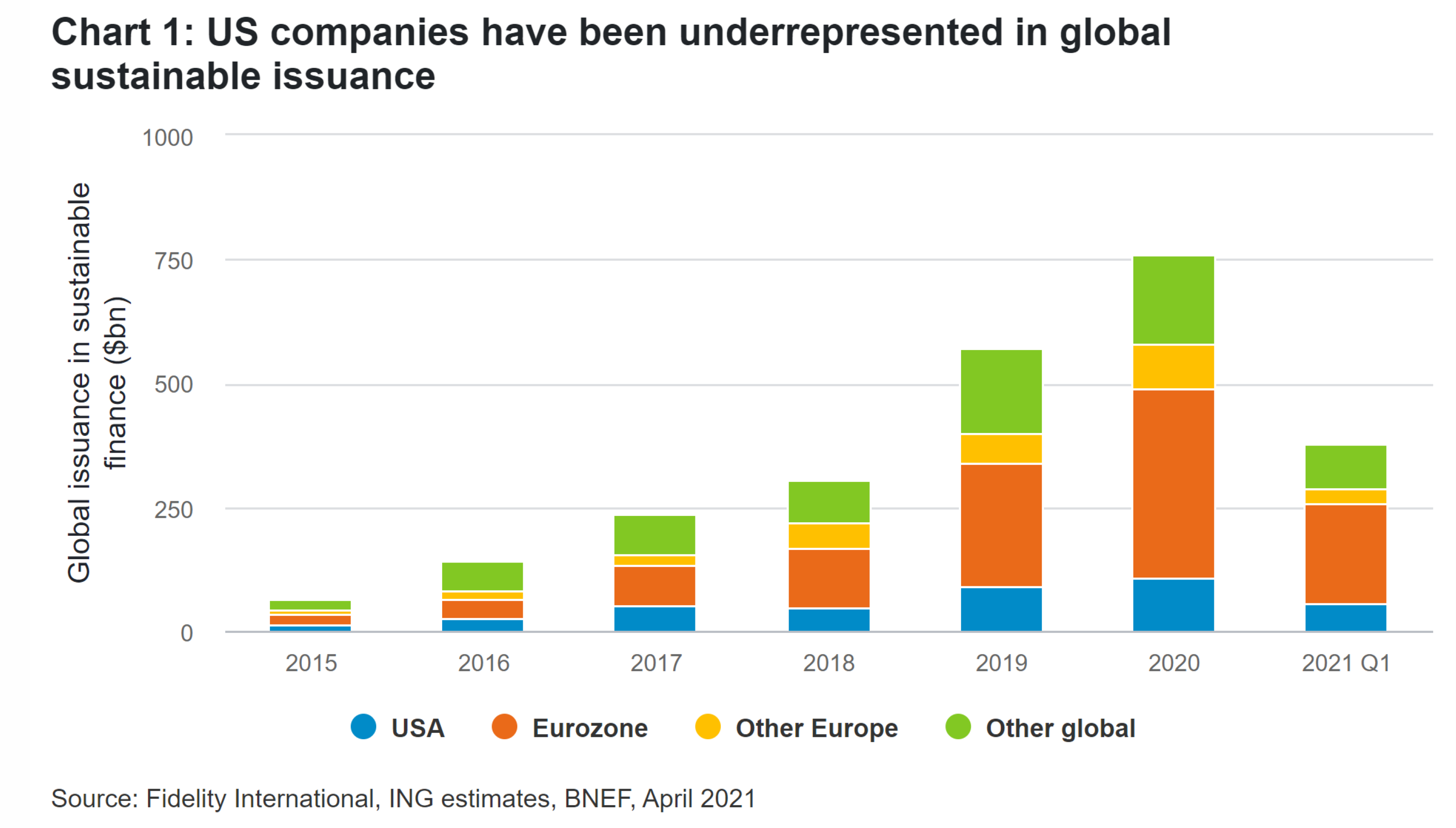 Trh se zelenými dluhopisy od podpisu Pařížské dohody v roce 2015 rostl rychle, přesto představuje pouze jedno procento dluhopisů globálního rozvinutého trhu. USA mají méně emitentů, než by mít mohly. Nicméně právě navrhované výdaje ve výši dvou bilionů dolarů, jejichž cílem je zlepšení environmentální a sociální udržitelnosti, otevírají v USA dveře pro rostoucí počet emisí zelených vládních dluhopisů (neboli „Greasuries") a udržitelných dluhopisů obecně.