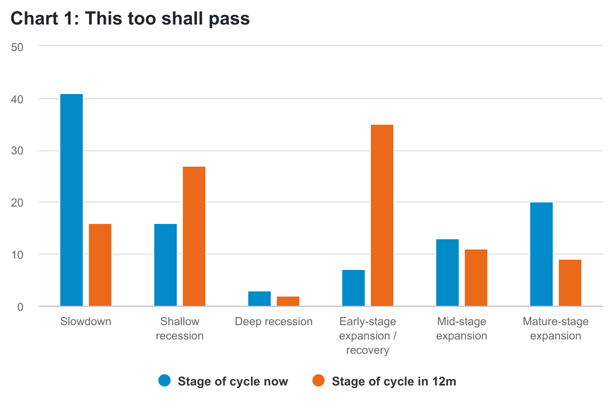 Průzkum, který provádíme již více než deset let, oslovuje řadu odborníků na dluhopisy, akcie, soukromé úvěry a ostatní aktiva, kteří pokrývají desítky dílčích sektorů ekonomiky. Z něj vyplývá, že 60 % analytiků se domnívá, že jim svěřené sektory se již nacházejí ve fázi zpomalení, mělké recese nebo jsou na tom ještě hůř. Podíváme-li se však jen o něco dále, více než polovina těchto analytiků očekává, že se hospodářský cyklus do konce roku 2023 opět obrátí do kladných hodnot. Pouze hrstka z nich očekává hlubokou recesi.