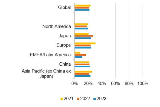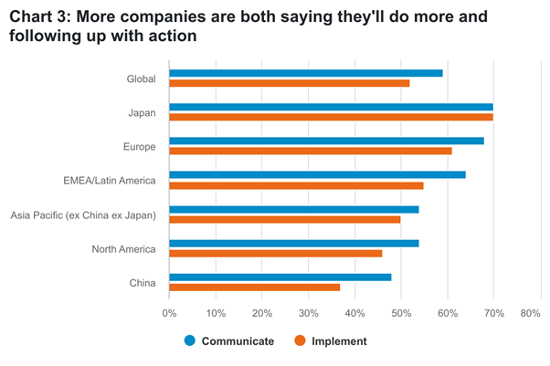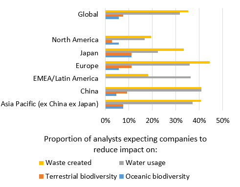Existuje několik výjimek. Téměř polovina analytiků regionu EMEA / Latinská Amerika uvádí, že jimi pokrývané společnosti kladou menší důraz na ESG než před rokem. Jedna analytička z průmyslového odvětví vysvětluje, že společnosti, které pokrývá, "se zkrátka snaží udržet nad vodou", a proto "ESG ustoupilo do pozadí".