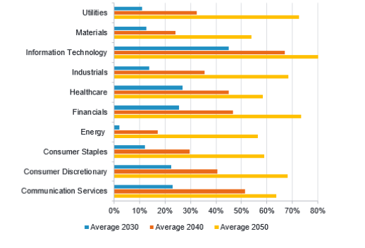Postupem času by se mělo k uhlíkové neutralitě přiblížit mnohem vice společností, i když většina z nich se k cíli dostane až po roce 2030. Naši analytici očekávají, že do roku 2040 bude celosvětově uhlíkově neutrálních 42 % společností a do roku 2050 bude tento podíl činit 68 %. Přitom se berou v úvahu všechny emise spojené s činností společnosti, tedy nejen ty, které společnost sama vytvaří, ale i ty, které vznikají v rámci jejího hodnotového řetězce. Když vezmeme rovněž v úvahu, že některé ze společností, u nichž se nepředpokládá, že budou za 17 nebo 27 let uhlíkově neutrální, již nemusí existovat, sledujeme výrazný posun.