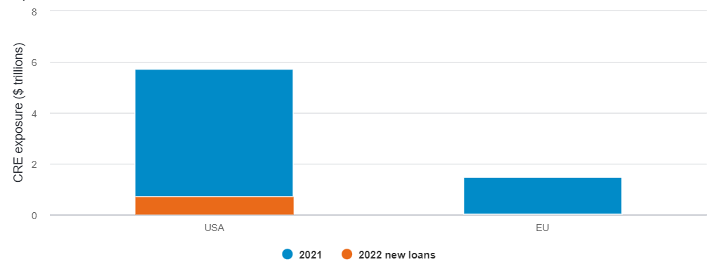 Evropská odolnost se šíří i mimo samotné kanceláře. Evropské banky jsou tomuto sektoru vystaveny rizikům méně než jejich americké protějšky. Úvěry na komerční využití nemovitostí tvoří přibližně sedm procent expozice evropských bank; u větších amerických bank je to téměř dvojnásobek, 13 procent, a šestkrát více - tedy 43 procent úvěrového portfolia u menších a regionálních amerických bank. Ty se dostaly do centra pozornosti po pádu SVB.