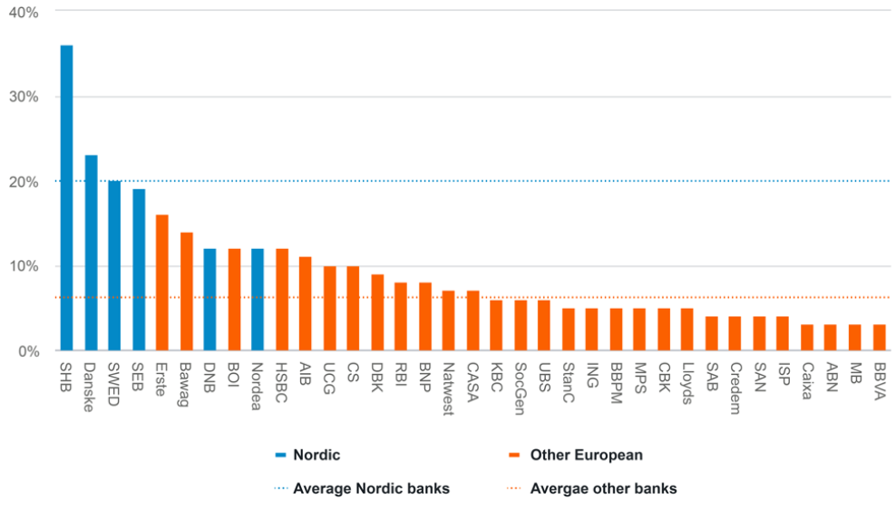Severské země jsou totiž jediným regionem v Evropě, kde je expozice bank vůči úvěrům z nemovitostí srovnatelná s USA, přičemž úvěry z nemovitostí tvoří více než pětinu úvěrového portfolia Handelsbanken, Danske Bank a Swedbank.