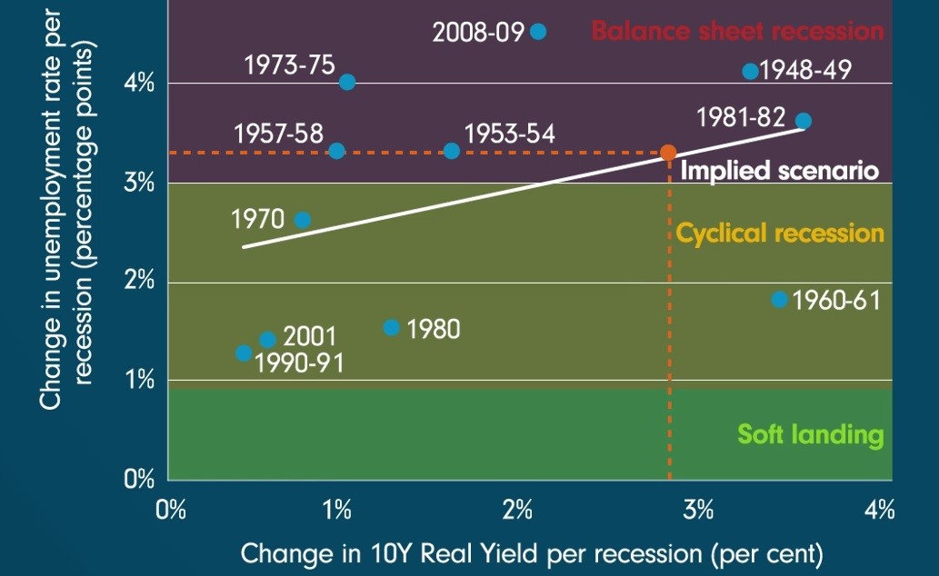 Když se podíváme na změny reálného výnosu desetiletého dluhopisu v USA v období 12 měsíců před každou recesí od druhé světové války zjistíme, že čím větší bylo zpřísnění, tím vyšší byla následně nezaměstnanost. Z tohoto jednoduchého lineárního vztahu vyplývá, že současná míra nezaměstnanosti na základě maximální změny desetiletých reálných výnosů dluhopisů, která byla dosud zaznamenána (282 bazických bodů) by se mohla zvýšit o více než 3procentní body. To by znamenalo, že nás čeká měkčí ze spektra "bilanční" recese - hluboká recese je často prohloubena tím, že domácnosti a/nebo podniky snižují zadlužení ve své bilanci.