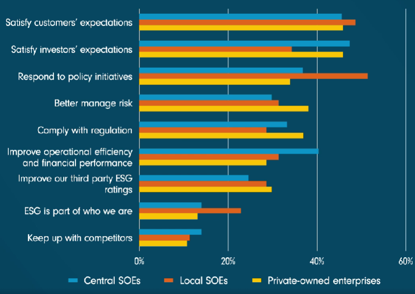 To je klíčové zjištění nedávného průzkumu společnosti Fidelity International mezi 262 vedoucími pracovníky a řediteli společností se sídlem v Číně. Na otázku, jaké jsou jejich tři hlavní motivace, uvedla téměř polovina těch, co plánují strategii ESG, že reagují na očekávání zákazníků. Skoro 44 % se pro změnu snaží řešit obavy investorů. To přitom platí pro veřejný i soukromý sektor. Tyto dva důvody uvádí jako své hlavní víc jak státních podniků (SOE), tak soukromých podniků než těch, které tvrdí, že tak činí kvůli lepší provozní efektivitě, finanční výkonnosti nebo hodnocení ESG třetí stranou.