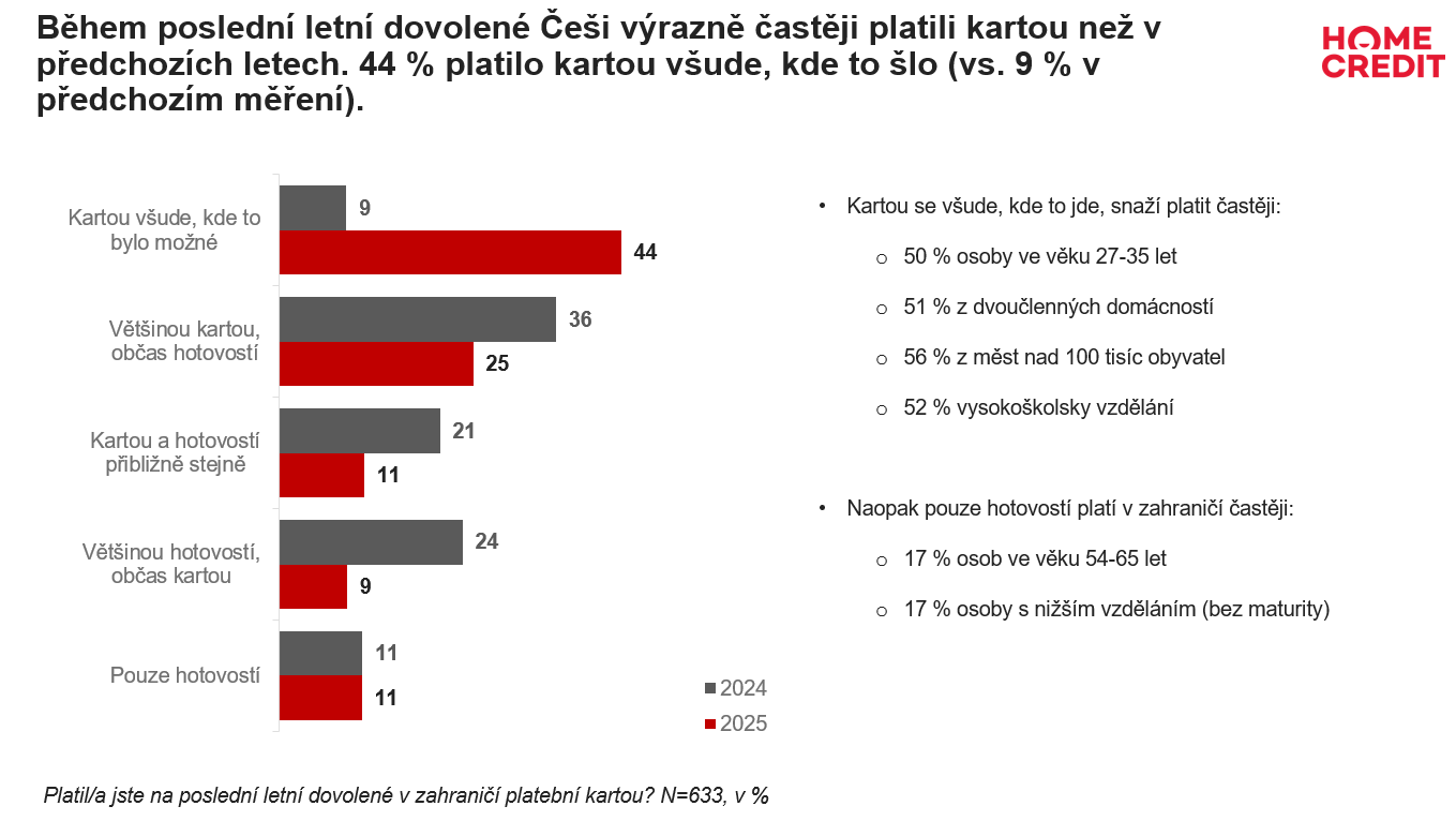 Čeští turisté zažívají revoluci v platebních zvyklostech. „Zatímco v loňském roce platilo kartou všude, kde to bylo možné, pouze 9 % Čechů, v letošním roce toto číslo dramaticky vzroste na 44 %. Podobný trend v přechodu na bezhotovostní platby zaznamenává i Slovensko, kde dvě třetiny turistů na zahraničních cestách pravidelně využívají platební karty, přičemž nejaktivnější jsou mladí lidé ve věku 18 až 26 let. Přesto 22 % Slováků používá kartu v zahraničí jen občas a 3 % ji nepoužívají vůbec. Pro české cestovatele platí, že trend bezhotovostních plateb je nejvýraznější u mladších dospělých ve věku 27-35 let, kde 50 % z nich plánuje platit kartou při každé příležitosti. Podobně progresivní jsou obyvatelé dvoučlenných domácností (51 %), lidé z velkých měst s více než 100 tisíci obyvateli (56 %) a vysokoškolsky vzdělaní jedinci (52 %),“ uvádí Jaroslav Ondrušek, analytik společnosti Home Credit a dodává: „Na opačném konci spektra stojí senioři ve věku 54-65 let a osoby bez maturity – v obou těchto skupinách se na hotovost jako výhradní platební metodu v zahraničí spoléhá shodně 17 % dotázaných. Tento výrazný posun směrem k digitalizaci plateb odráží rostoucí důvěru Čechů v bezhotovostní transakce i v zahraničním prostředí.“