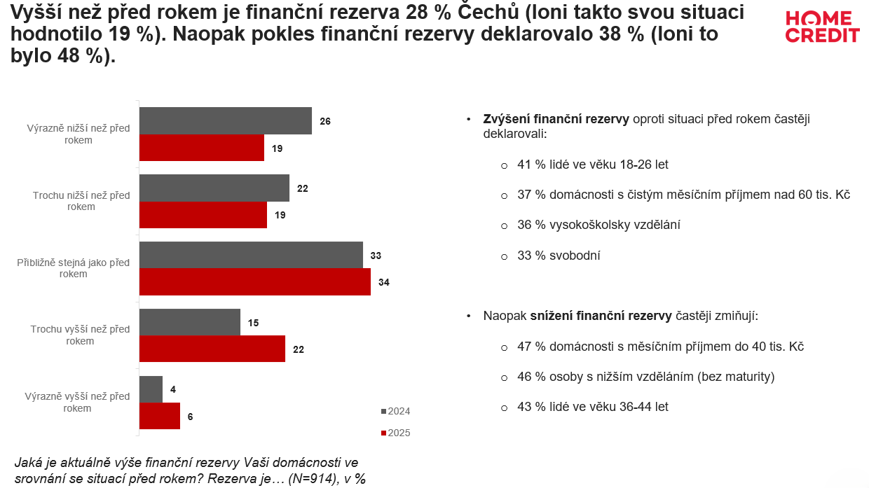 Finanční situace Čechů se ve srovnání s loňským rokem zlepšila – vyšší finanční rezervu nyní deklaruje 28 % lidí, zatímco loni to bylo pouze 19 %. Naopak pokles rezervy uvedlo 38 % respondentů, což je výrazné zlepšení oproti loňským 48 %. Největší nárůst rezerv hlásí mladí lidé ve věku 18–26 let (41 %), domácnosti s příjmem nad 60 tisíc korun měsíčně (37 %), vysokoškolsky vzdělaní (36 %) a svobodní (33 %). Na opačné straně spektra se pokles rezervy nejčastěji týká domácností s příjmem do 40 tisíc korun měsíčně (47 %), lidí bez maturity (46 %) a osob ve věku 36–44 let (43 %). Tato čísla ukazují, že i přes pozitivní trendy zůstávají mezi jednotlivými skupinami obyvatel výrazné rozdíly v možnostech tvořit finanční rezervy.