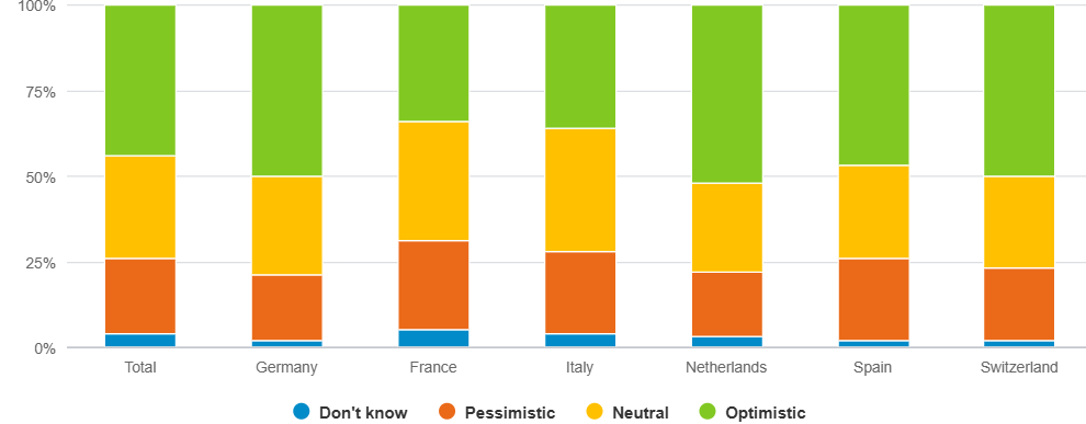 Navzdory geopolitickým a makroekonomickým problémům zůstává 44 % dotázaných evropských investorů optimistických ohledně směřování trhu v příštích 12 měsících. Proti tomu stojí 22 % pesimistů (viz obrázek 1). Míra optimismu se však v jednotlivých zemích lišila: například 52 % dotázaných investorů v Nizozemsku se cítí optimisticky, ale stejný názor vyjádřilo pouze 34 % investorů ve Francii.