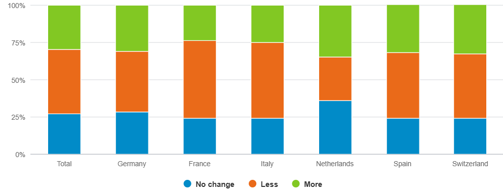 Naopak vyšší procento nizozemských investorů, 35 %, pravděpodobně v příštím roce investuje více v porovnání s investory v ostatních sledovaných zemích. Průměrné zvýšení investic činí 6 500 EUR. Podobně 34 % švýcarských investorů, kteří jsou rovněž optimističtější, pokud jde o akciový trh, uvádí, že ve stejném období pravděpodobně investují více, a to s mediánem navýšení o 12 500 EUR.
