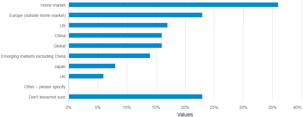 Mezi respondenty průzkumu 39 % uvedlo, že v nadcházejícím roce vidí nejlepší příležitosti v akciích, přičemž 54 % z nich již do této třídy aktiv investuje (viz graf 8). Jak se dalo očekávat, vzhledem k zaměření investorů na domácí trhy viděli dotázaní ve stejném období jako nejlepší prostor k nákupu akcií právě své trhy (viz obrázek 9).