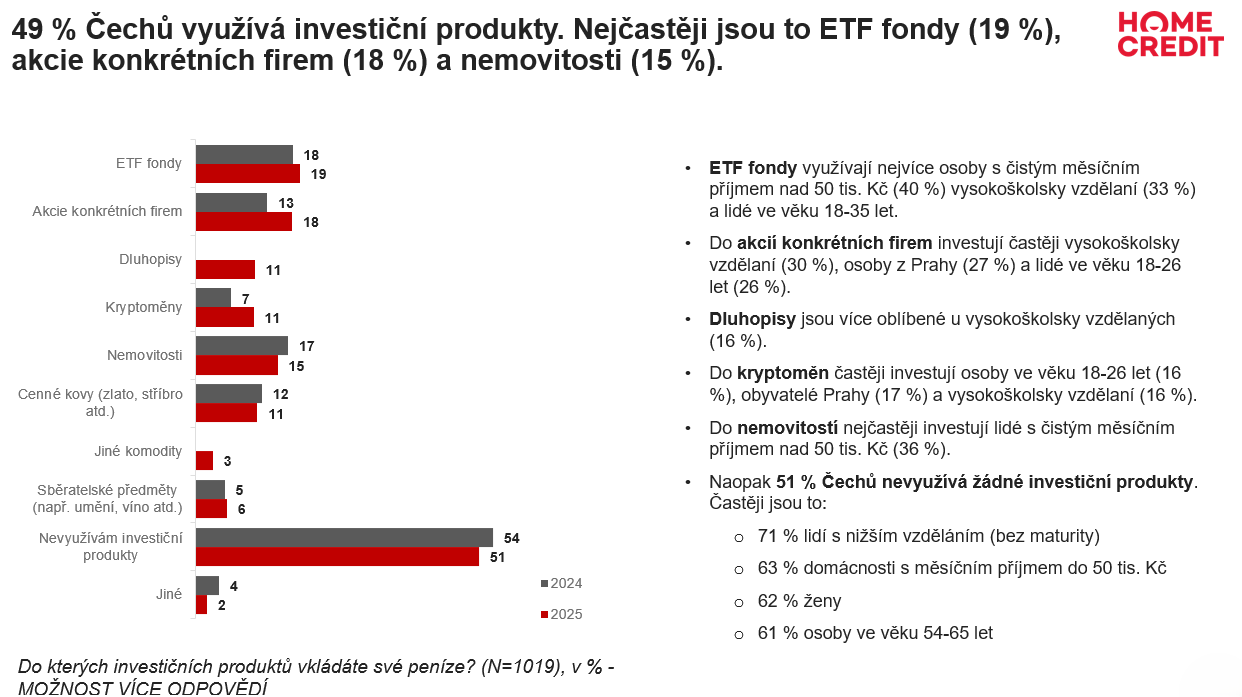 Investování se stává stále populárnější, zejména mezi mladými lidmi a vzdělanými Čechy. Investiční produkty využívá téměř polovina Čechů (49 %). Nejpopulárnější jsou ETF fondy, které využívá 19 % respondentů, mezi lidmi s příjmem nad 50 000 Kč je to až 40 %. Akcie konkrétních firem preferuje 18 % Čechů, nejčastěji vysokoškoláci (30 %) a mladí ve věku 18–26 let (26 %). Nemovitosti jsou oblíbené zejména mezi lidmi s vyššími příjmy (36 %), zatímco kryptoměny přitahují mladé investory a obyvatele Prahy. Naopak 51 % Čechů neinvestuje vůbec, přičemž nejčastěji jde o ženy, osoby bez maturity a domácnosti s nižšími příjmy.