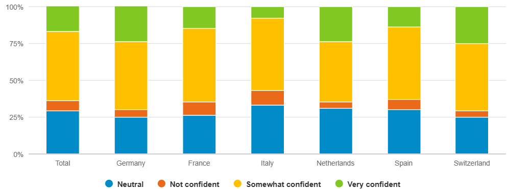 Dvě třetiny respondentů jsou navíc přesvědčeny, že jejich investiční portfolio dosáhne dlouhodobých cílů. Obzvlášť silně to pociťují investoři v Německu, Nizozemsku a Švýcarsku, kde přibližně čtvrtina respondentů uvedla, že jsou si „velmi jisti“, že jsou na§úl dobré cestě k dosažení dlouhodobých cílů. Zatímco v Itálii pouze 8 % respondentů říká, že jsou si „velmi jisti“, že se jim to podaří (viz graf 2).