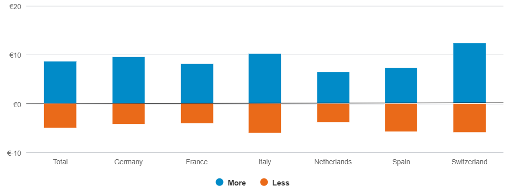 Naopak vyšší procento nizozemských investorů, 35 %, pravděpodobně v příštím roce investuje více v porovnání s investory v ostatních sledovaných zemích. Průměrné zvýšení investic činí 6 500 EUR. Podobně 34 % švýcarských investorů, kteří jsou rovněž optimističtější, pokud jde o akciový trh, uvádí, že ve stejném období pravděpodobně investují více, a to s mediánem navýšení o 12 500 EUR.