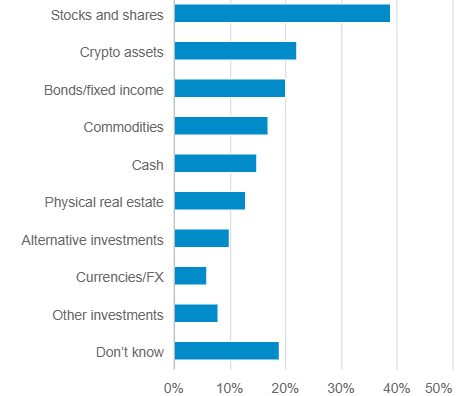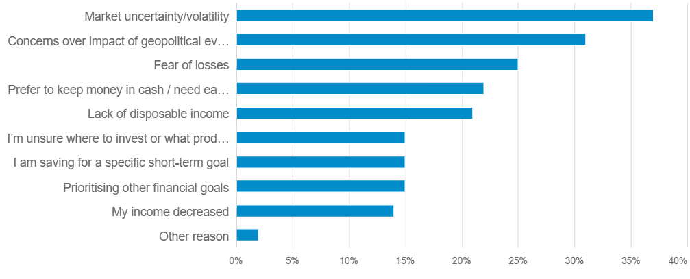Respondenti, kteří budou v příštím roce pravděpodobně investovat méně, uvádějí jako hlavní důvody: nejistota na trhu, geopolitické obavy a strach ze ztrát, a to 37 %, 31 % a 25 % (viz graf 5). Čtvrtina respondentů by raději ponechala své peníze v hotovosti. Přibližně 21 % také uvádí, že jim chybí kapitál na investice.
