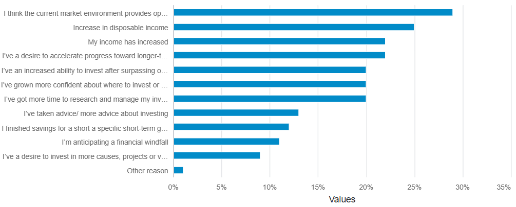 Jak ukazuje obrázek 6, čtyři hlavní důvody pro doplnění investičního portfolia patří: využití tržních příležitostí (29 %), zvýšení disponibilního příjmu (25 %), zvýšení příjmu (22 %) a snaha urychlit dosažení dlouhodobých finančních cílů (22 %).