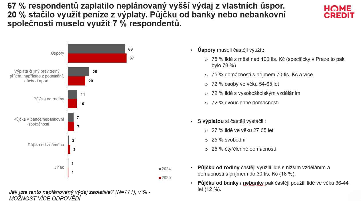 Z průzkumu vyplynulo, že 67 % dotázaných zaplatilo neplánované vyšší výdaje z vlastních úspor. Celkem 20 % dotazovaných si letos vystačilo s penězi z výplaty, v loňském roce to bylo o pět procentních bodů více. Půjčku od banky nebo nebankovní společnosti využilo 7 % respondentů. Úspory častěji využívali lidé z měst nad 100 tis. obyvatel (75 %), konkrétně v Praze to bylo 78 %, a domácnosti s příjmem 70 tis. Kč a více. S výplatou si častěji vystačili lidé ve věku 27–35 let (27 %) a svobodní (25 %). Půjčku od rodiny si častěji brali lidé s nižším vzděláním a domácnosti s příjmem do 30 tis. Kč (16 %), zatímco půjčky od banky nebo nebankovního poskytovatele půjček využívali spíše lidé ve věku 36–44 let (12 %).