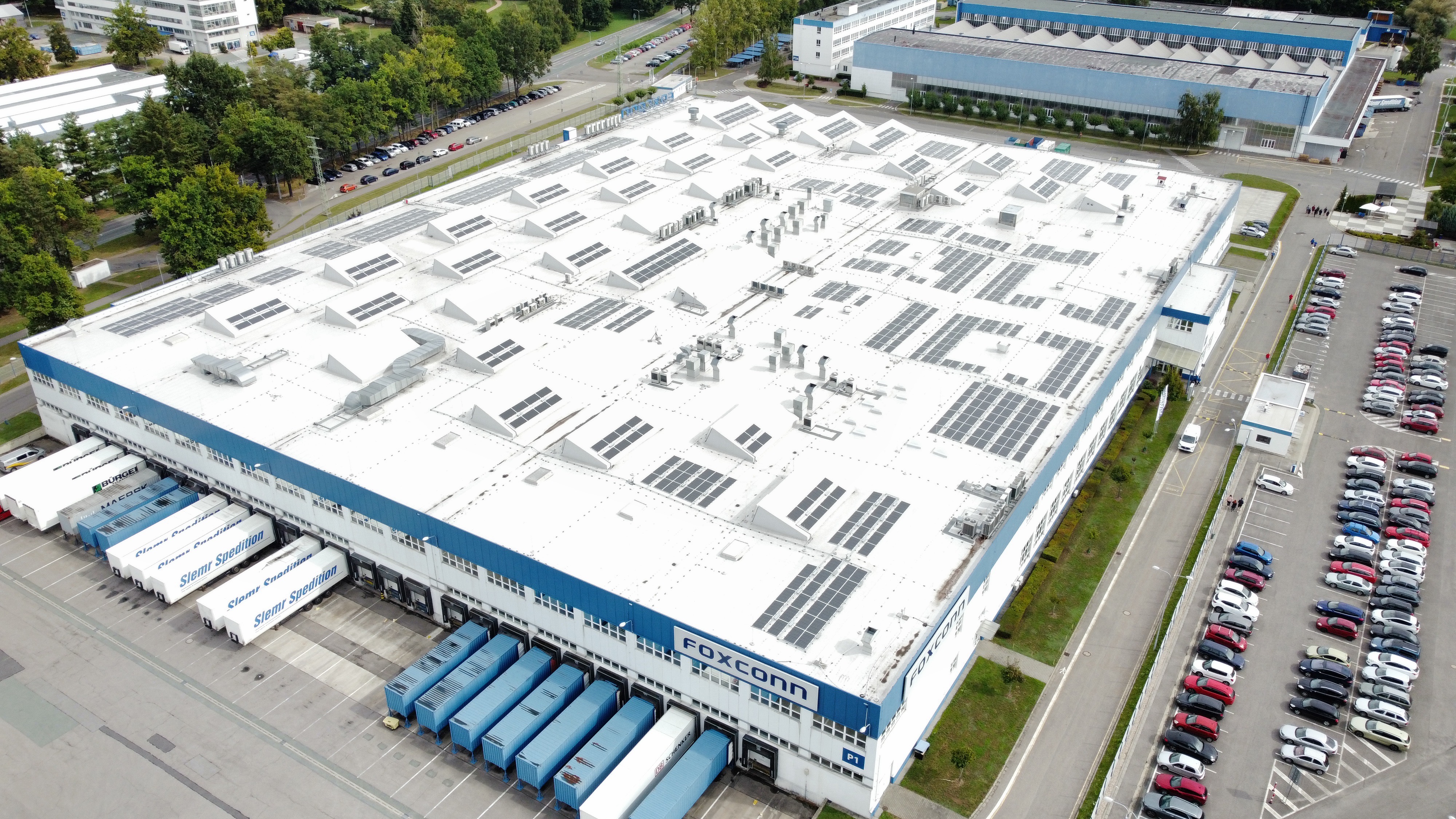 Na střechu závodu Foxconn v Pardubicích bylo umístěno více než tisíc odlehčených solárních panelů, které jsou až o polovinu lehčí než běžné skleněné panely.