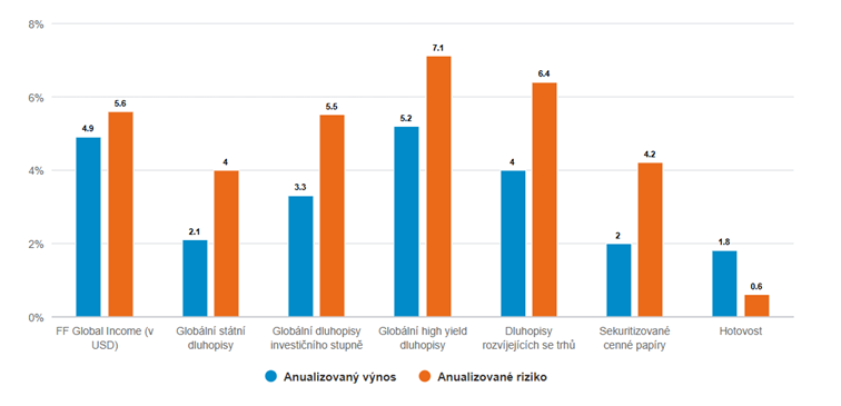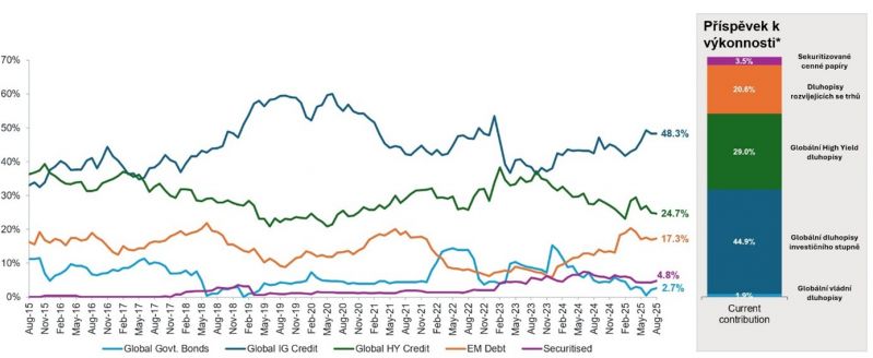 Zdroj: Fidelity International, Bloomberg, 31. srpna 2025.* *Výkonnost odráží akcie FF Global Income A-MINCOME(G)-USD Hedged, nav-nav s reinvestovaným výnosem, před odečtením poplatků (roční náklady činí 1,32 % pro akcie třídy A a 0,80 % pro akcie třídy Y) – na základě měsíčních dat od 31. ledna 2014 (třída akcií byla zavedena 10. ledna 2014). Reference ICE BofA indexy (uvedené pouze pro ilustrační účely); globální státní dluhopisy = ICE BofA Global Government Index („W0G1“), globální dluhopisy investičního stupně = ICE BofA Global Corporate Index („G0BC“), globální high yield dluhopisy = ICE BofA Global High Yield Constrained Index („HW0C“), dluhopisy rozvíjejících se trhů = ICE BofA US Emerging Markets Liquid Corporate Plus Index („EMCL“), sekuritizované cenné papíry = ICE BofA Global Collateralized Index („G0BL“), hotovost = ICE BofA SOFR Overnight Rate Index („L0US“) – na základě měsíčních dat zajištěných do USD od 31. ledna 2014.