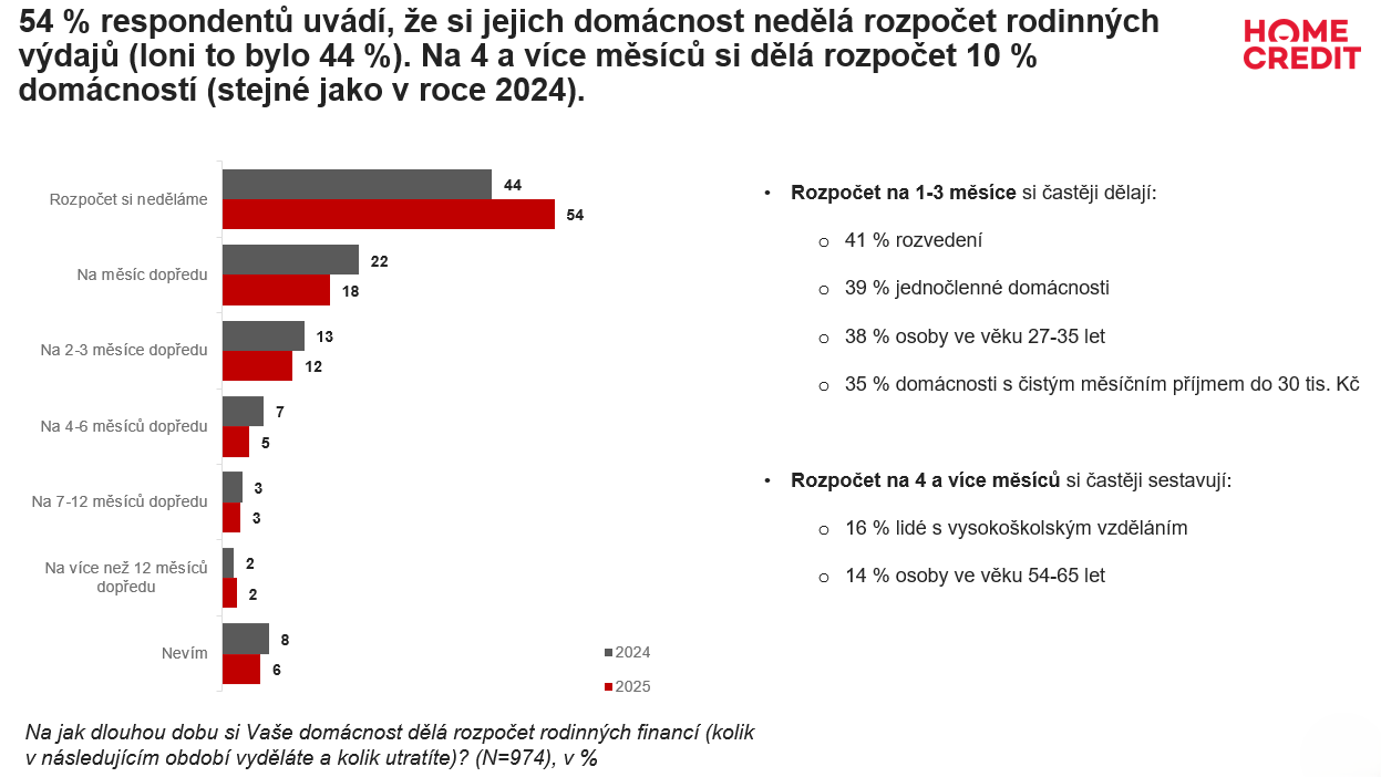 „Červnový průzkum odhalil, že 54 % českých domácností si nedělá žádný rozpočet rodinných výdajů, což je varující nárůst oproti 44 % v roce 2024,“ komentuje výsledky šetření Jaroslav Ondrušek, analytik společnosti Home Credit, a dále je rozvádí: „Rozpočet v horizontu do tří měsíců si častěji připravují rozvedení (41 %), jednočlenné domácnosti (39 %), lidé ve věku 27–35 let (38 %) a domácnosti s čistým měsíčním příjmem do 30 tis. Kč. Rozpočtům na delší, než čtyřměsíční období se věnují spíše lidé s vysokoškolským vzděláním (16 %) a osoby ve věku 54–65 let (14 %).“