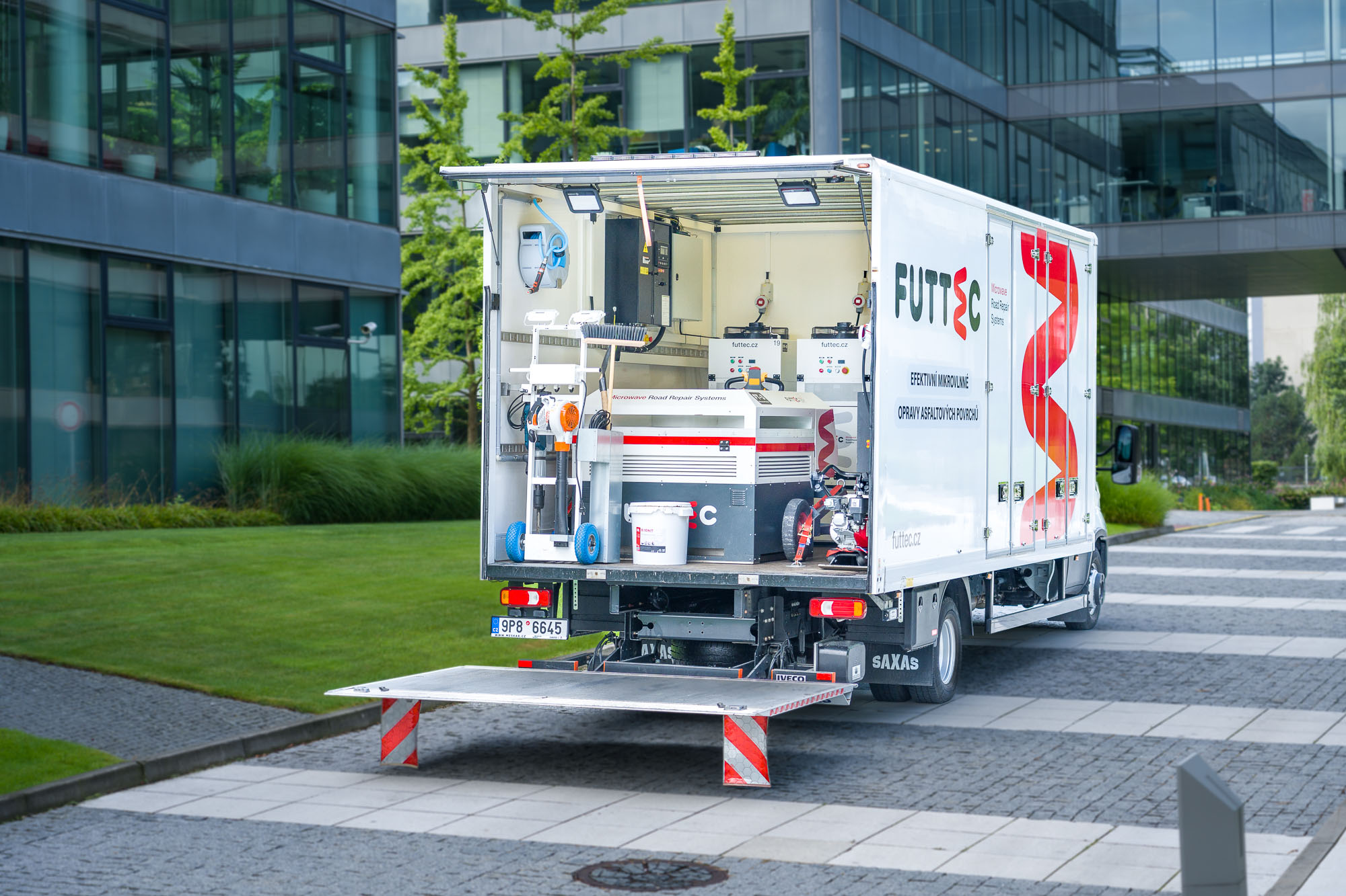Nová sestava „mikrovlnného cestáře“ FT-3 je stejně jako její předchůdkyně určená k preventivní neinvazivní údržbě asfaltových vozovek – tedy celoroční a bezespáré opravě výtluků do velikosti přibližně 80 x 80 cm. Celý systém se nově skládá ze dvou mikrovlnných pecí s vyjímatelným zásobníkem pro ohřev asfaltové směsi a z dalšího příslušenství: mj. z ručně vedeného mikrovlnného zářiče s elektrickým pohonem určeného na ohřev asfaltových vrstev v ploše poruchy, ocelového přepravního kontejneru, vratných pytlů se speciální asfaltovou směsí, odhlučněné elektrocentrály, 150litrové nádrže na vodu pro chlazení směsi při hutnění či z hutnicí desky. „Všechny komponenty máme ve voze umístěny tak, jak jdou jednotlivé kroky opravy za sebou - tedy od přípravy výtluku přes opravu až po zprovoznění komunikace. Od dřívější verze se nová sestava liší především ve dvou věcech: v počtu pecí a odhlučnění elektrocentrály. Díky dvěma pecím probíhá ohřev asfaltové směsí rychleji a je tak možné v co nejkratší době zaplnit i větší a hlubší výtluky. Generátor v odděleném prostoru je pak optimalizovaný pro snížení hluku a vibrací. Ani v noci proto neobtěžuje posádku nebo obyvatele akustickými emisemi. Zajímavostí je, že je vůz napojený na servisní a poruchovou diagnostiku, která minimalizuje odstávky,“ vysvětluje Aleš Košťák, výrobní a provozní ředitel společnosti FUTTEC.