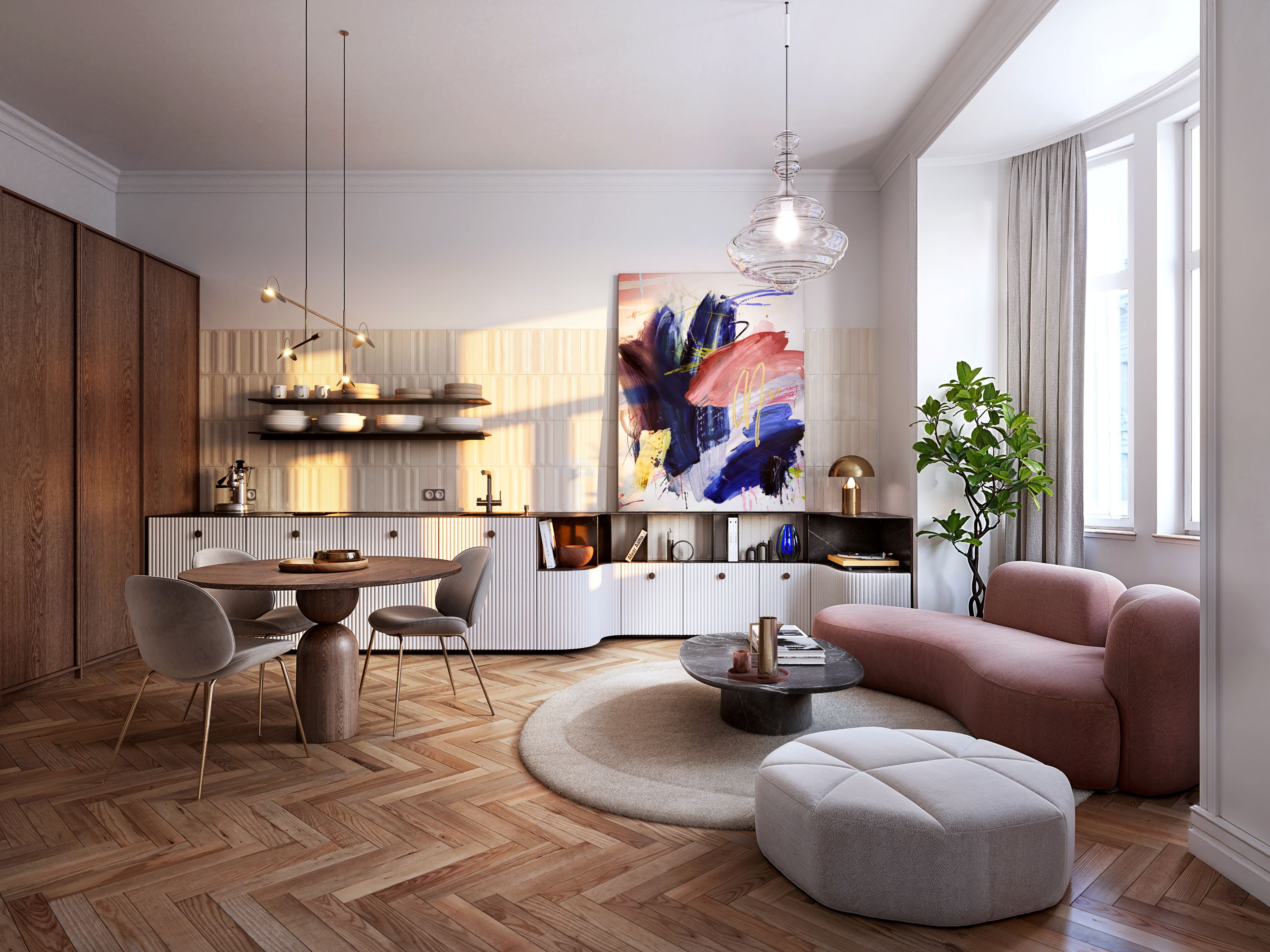 Byty o dispozicích 1,5+kk až 4+kk jsou nabízeny v provedení fit out, tedy připravené k okamžitému nastěhování. První etapa zahrnuje byty 2+kk a retailové jednotky. Interiéry pracují s přírodními materiály, jemnou barevností a důrazem na detail. Výsledkem je nadčasové řešení kombinující estetiku, praktičnost i dlouhodobou udržitelnost.