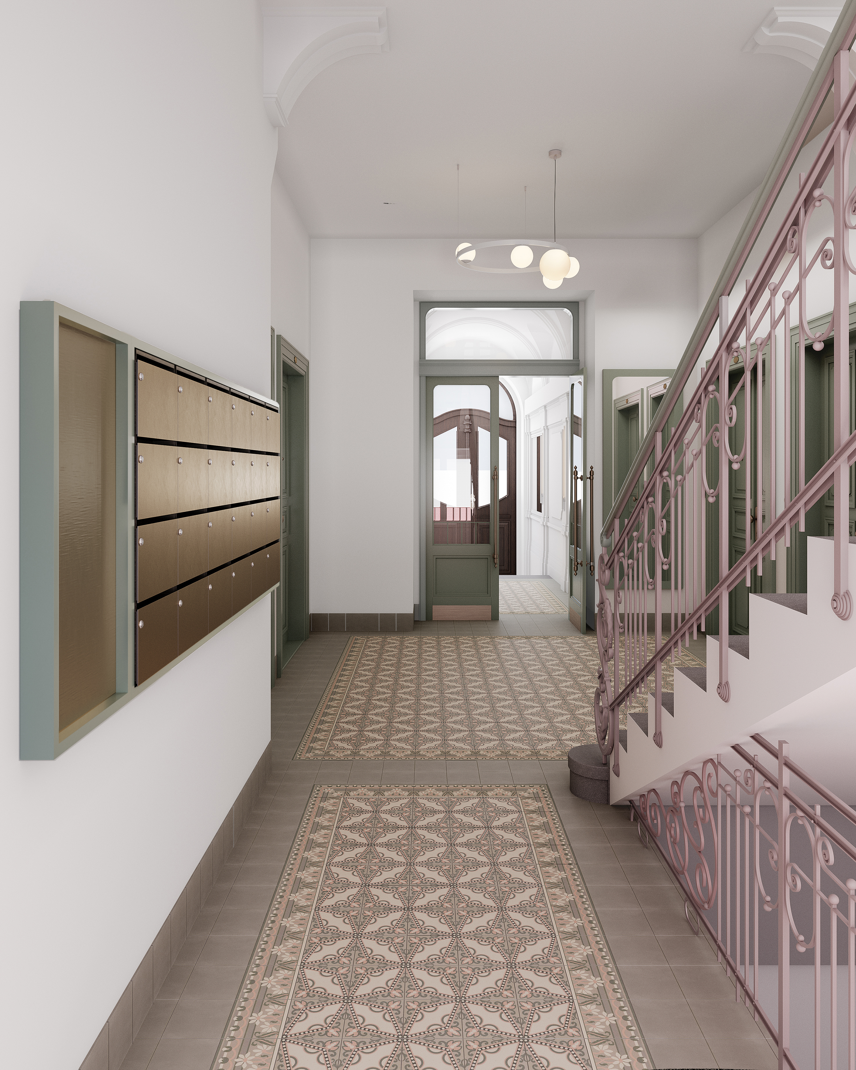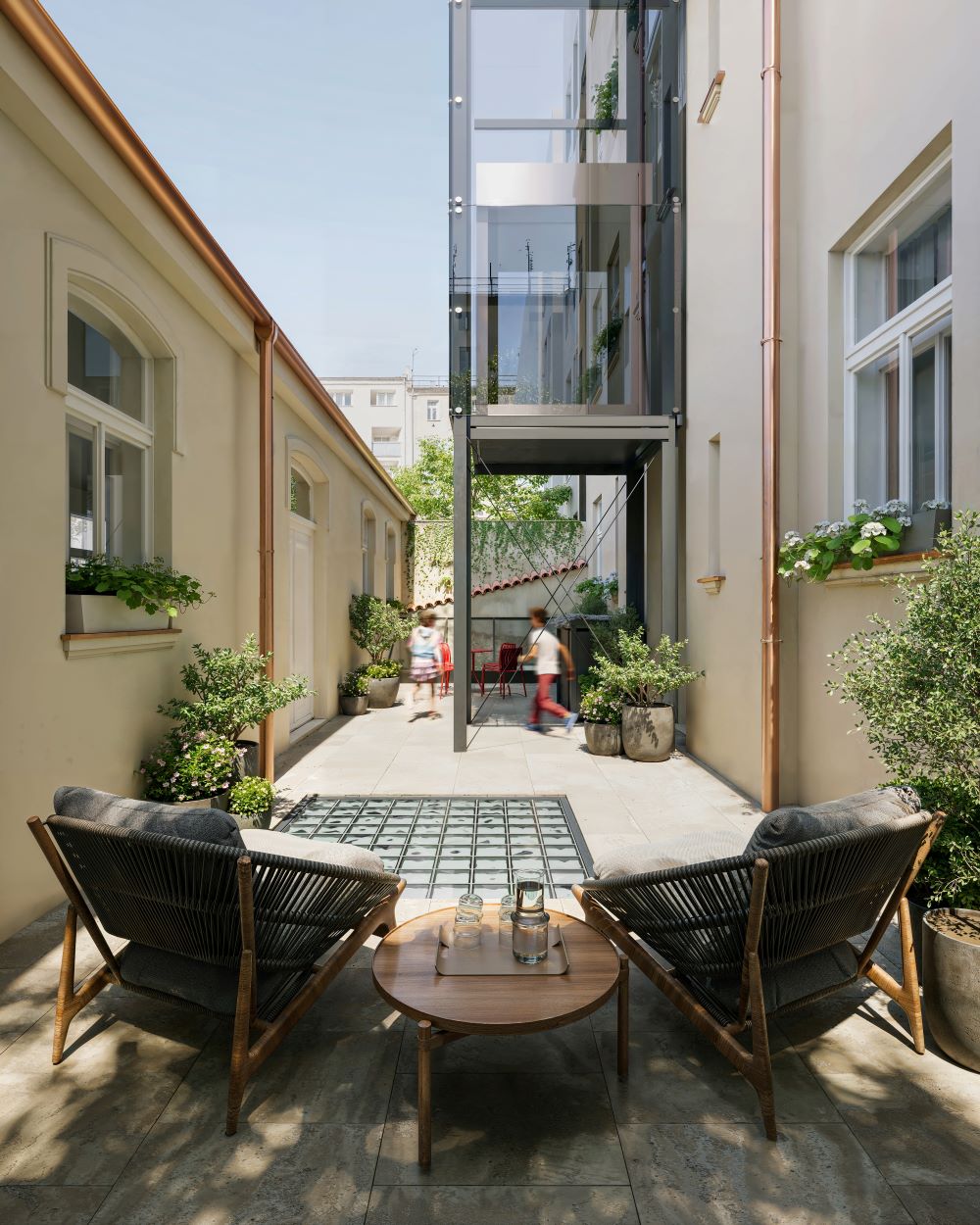 Standard zahrnuje mimo jiné dubové parketové podlahy, dřevěná špaletová okna a balkonové dveře s dvojsklem, kvalitní sanitu značek Laufen a Grohe i diskrétní technické detaily, které nenarušují design. V horním podlaží vzniknou také dva půdní byty s terasami orientovanými do klidného vnitrobloku. Pro zájemce bude připraven vzorový byt 2+kk.