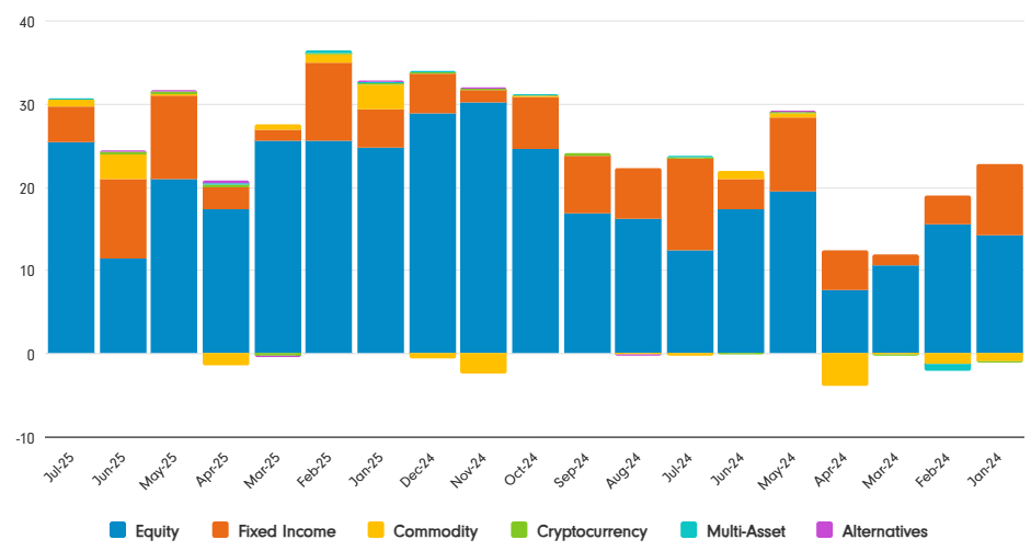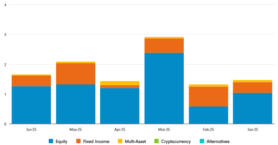 ·       Největší příliv kapitálu směřoval do akciových ETF v objemu 25 miliard USD, následovaný dluhopisovými se 4 miliardami USD, komoditními s 800 miliony USD a menšími příspěvky z oblasti kryptoměn, multi-asset a alternativních strategií.