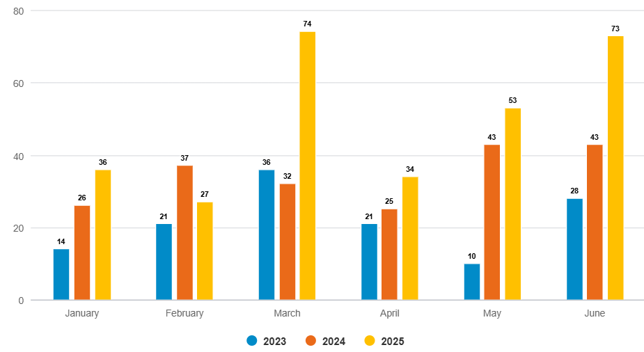 ●      Do konce června jsme zaznamenali v pěti ze šesti měsíců nové rekordy v počtu měsíčních spuštění nových ETF za poslední tři roky, s výjimkou února, kdy nejistota ohledně politických a právních kroků poněkud zpomalila počty nových fondů, než v březnu opět nabrala na síle.