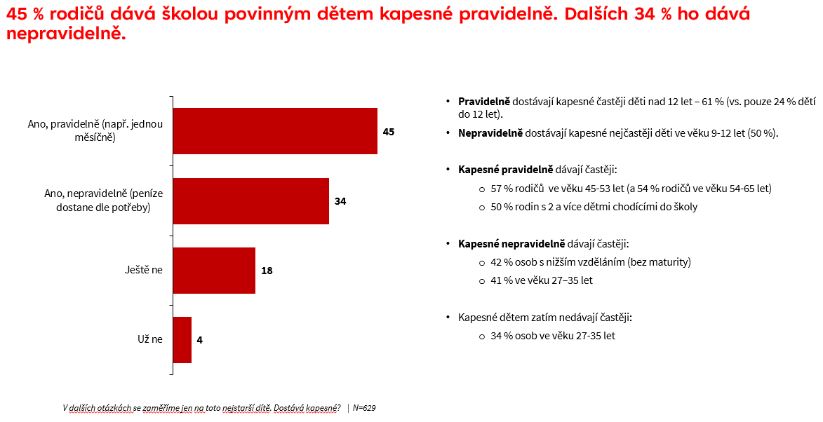 Věk, kdy děti začínají dostávat kapesné, je klíčový pro jejich finanční vzdělávání. Podle průzkumu* Home Creditu se tak nejčastěji děje mezi 8. a 10. rokem života, kdy 35 % dětí poprvé poznává hodnotu peněz. Tento moment je důležitý pro rozvoj finanční odpovědnosti a samostatnosti. Kapesné je pro děti nejen příležitostí, jak si pořídit drobné radosti, ale také důležitým nástrojem pro rozvoj finanční gramotnosti. Pravidelně ho dostává 45 % školou povinných dětí, zatímco 34 % rodičů poskytuje kapesné nepravidelně. Zajímavé je, že děti nad 12 let dostávají kapesné pravidelně ve 61 % případů. Tento finanční rituál je častější v rodinách s více dětmi a u rodičů ve věku 45-53 let.