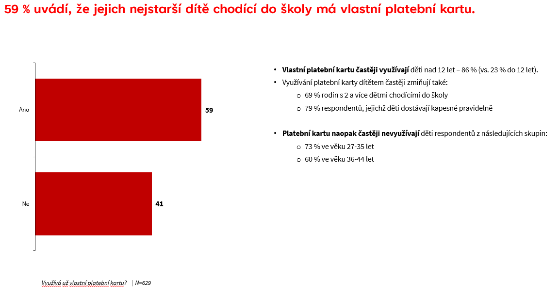 Vlastní platební karta je pro mnoho dětí symbolem důvěry a samostatnosti. Podle průzkumu Home Creditu ji má 59 % nejstarších školou povinných dětí. Děti nad 12 let ji využívají v 86 % případů, což reflektuje rostoucí trend digitalizace a potřebu dětí být finančně nezávislé. Rodiny s více dětmi a pravidelným kapesným jsou v tomto ohledu na špičce.
