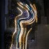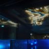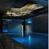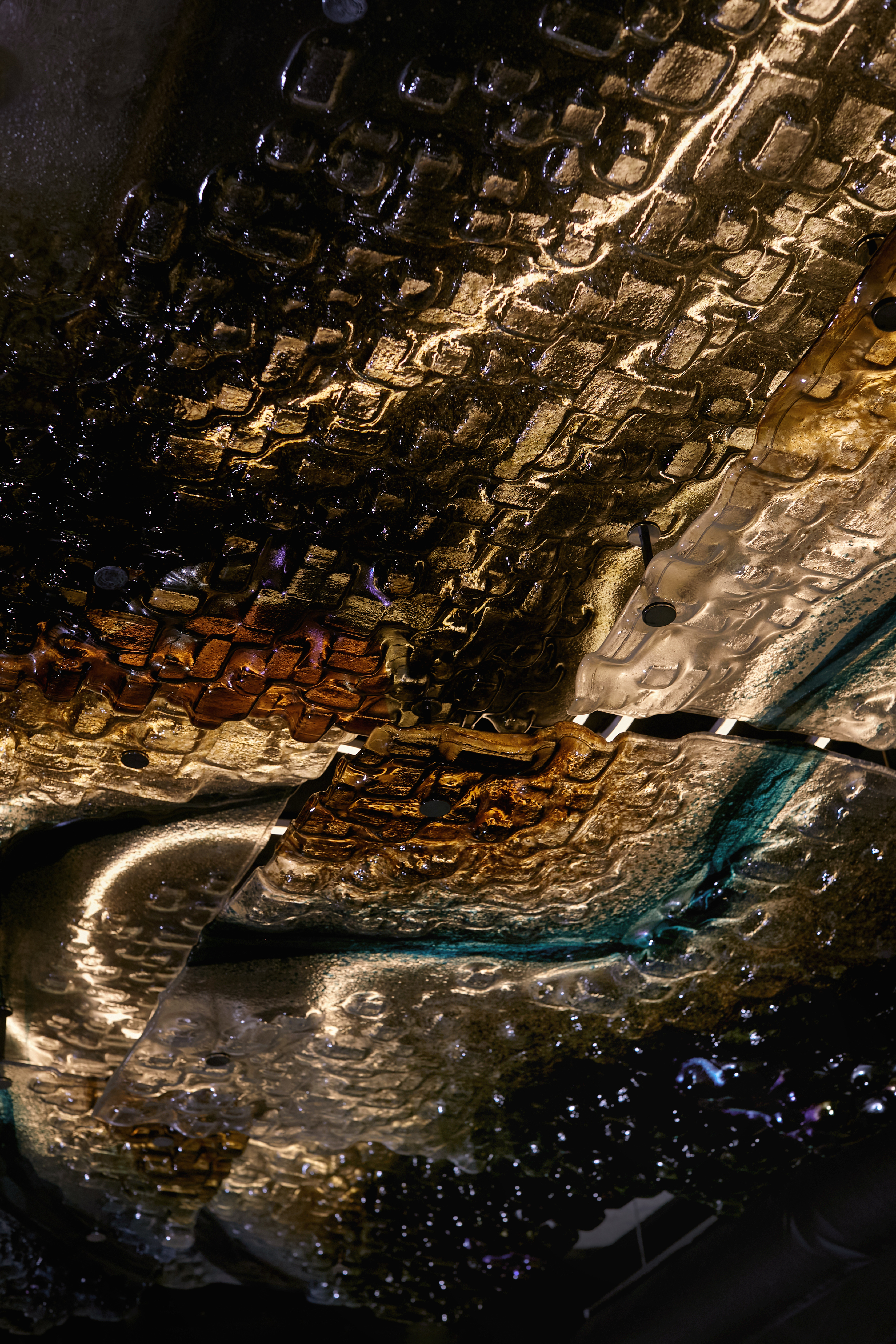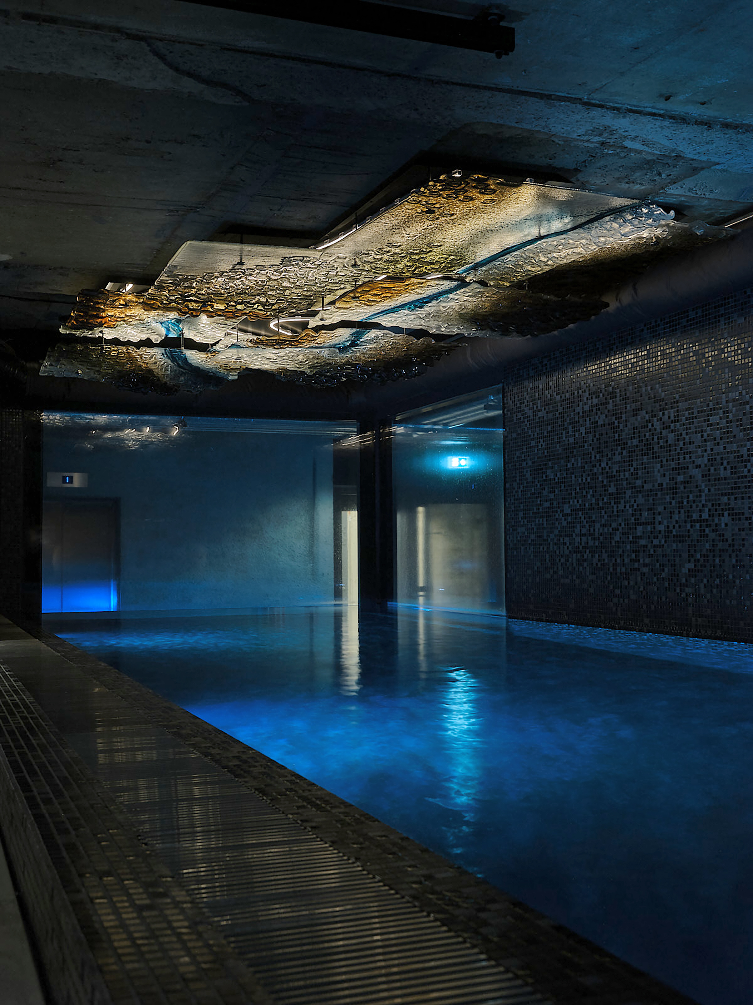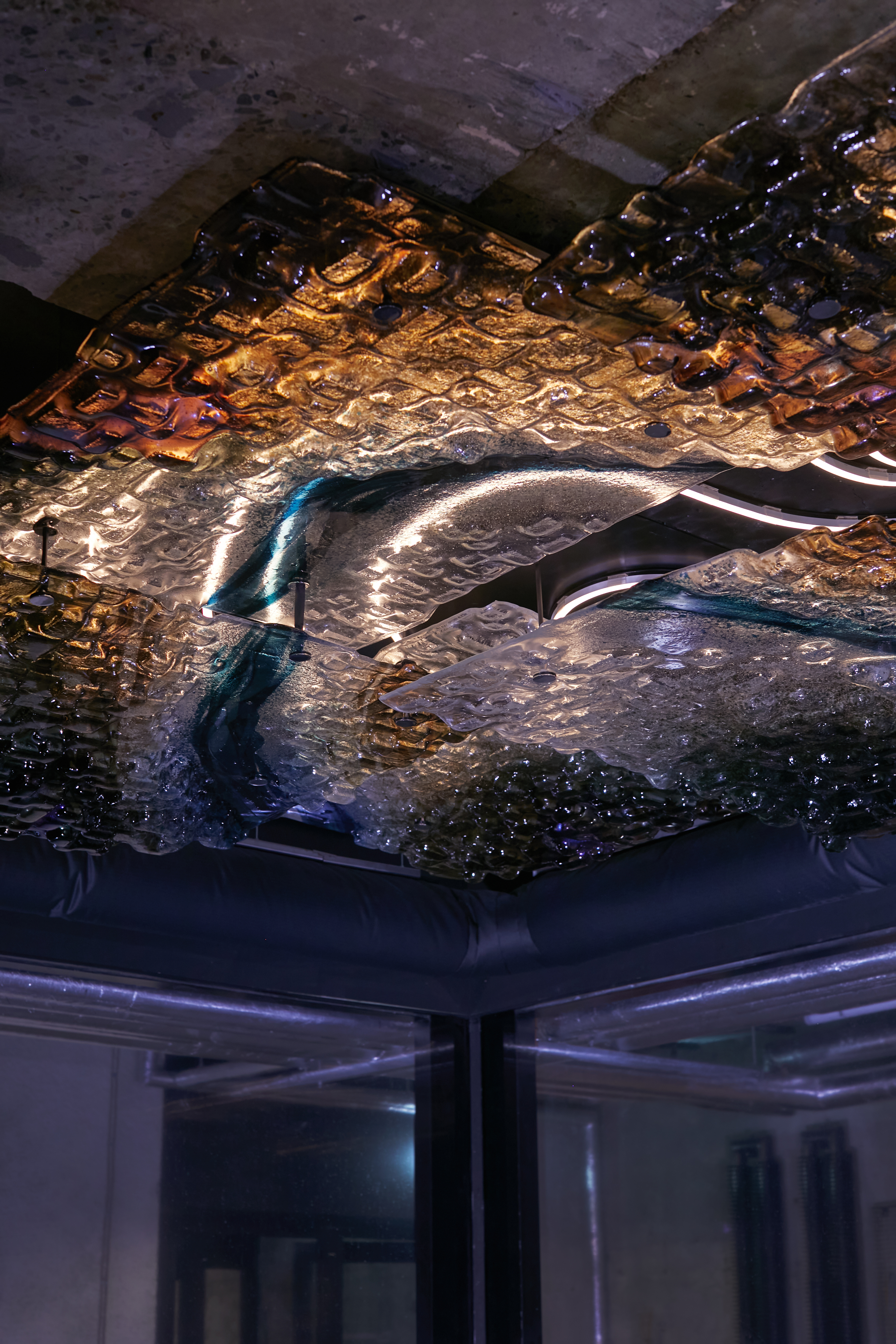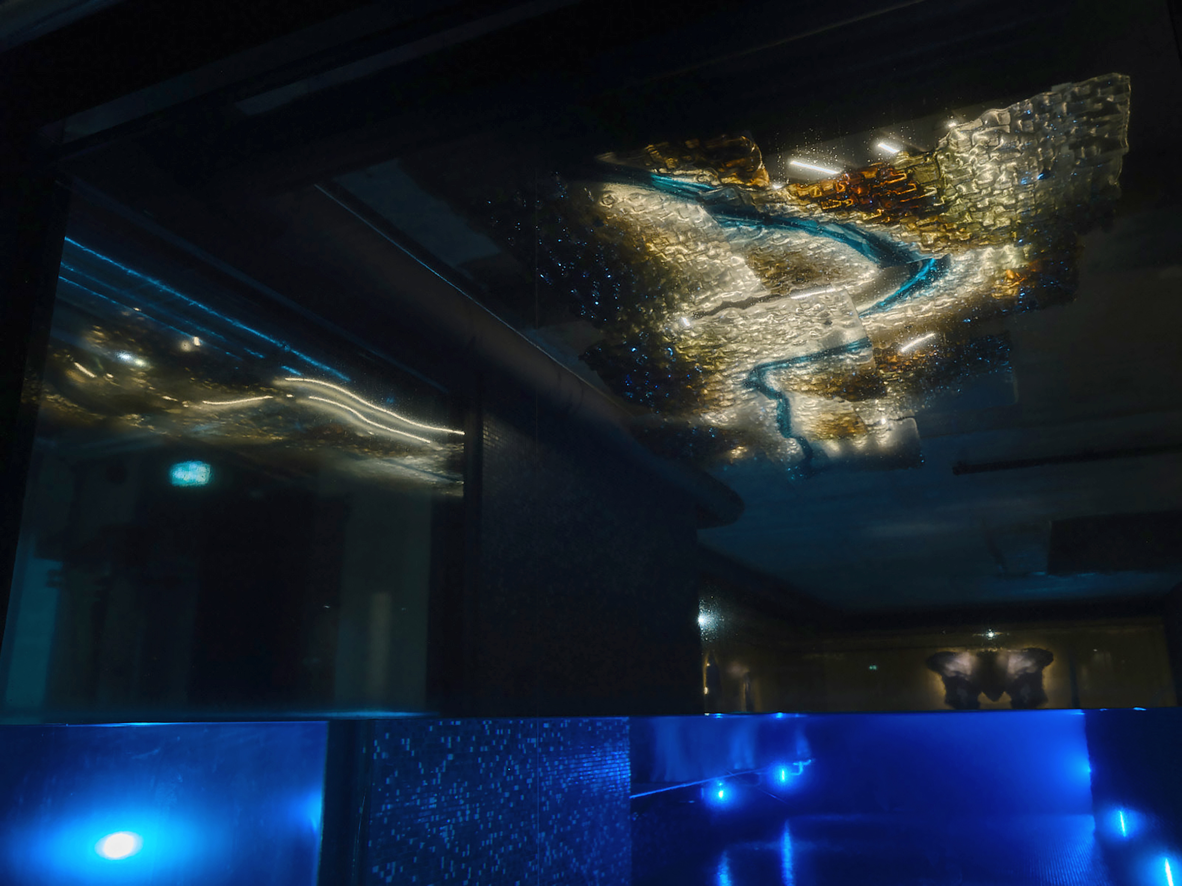 Reliéf vznikl lehaním skla do formy a díky preciznímu podsvícení působí jako krajinná mapa pozorovaná z výšky. Prostorová kompozice nad hladinou bazénu přirozeně navazuje na koncept celého projektu Vanguard, který propojuje industriální minulost s novou vrstvou designového a funkčního bydlení.