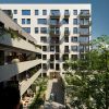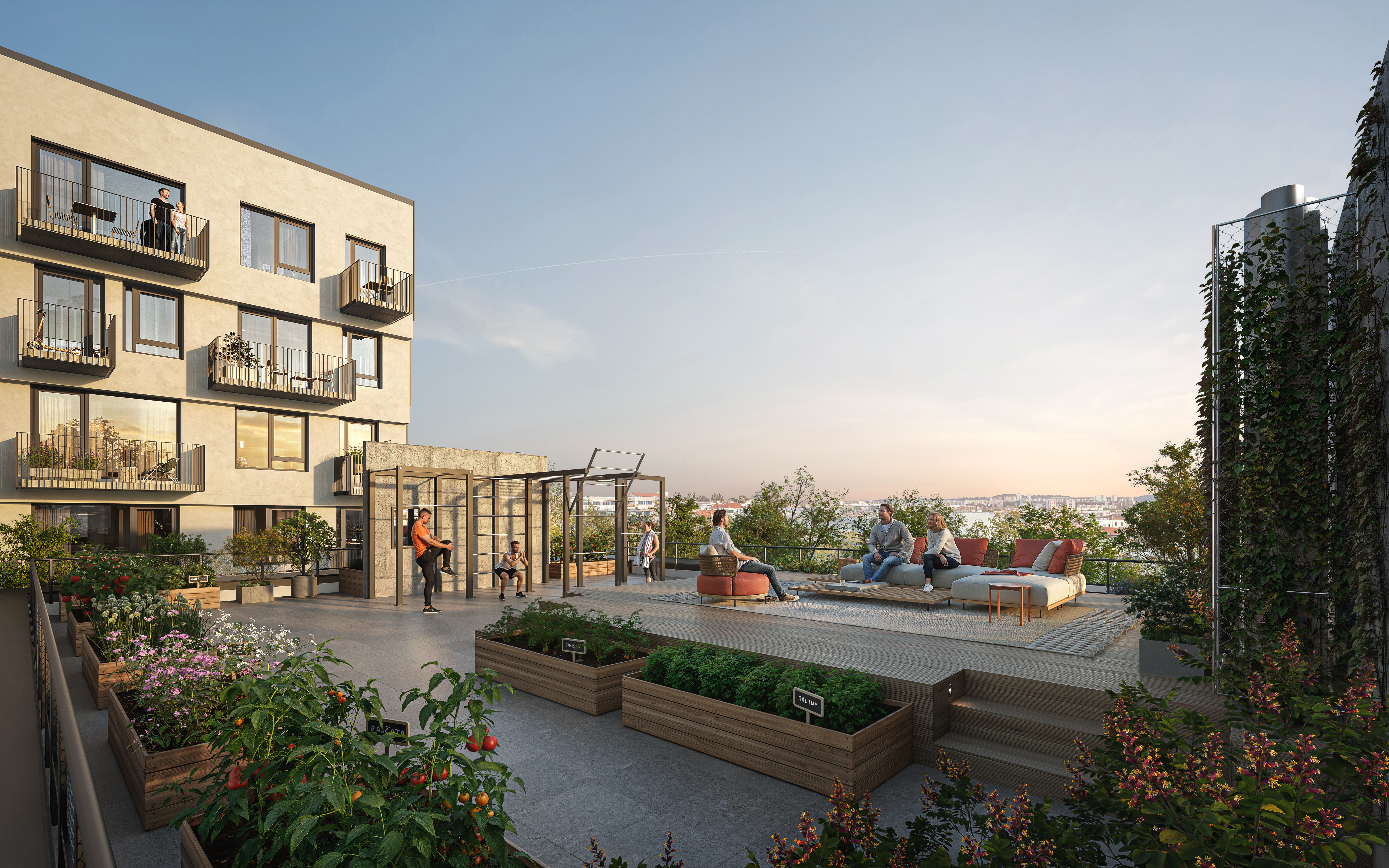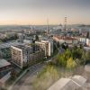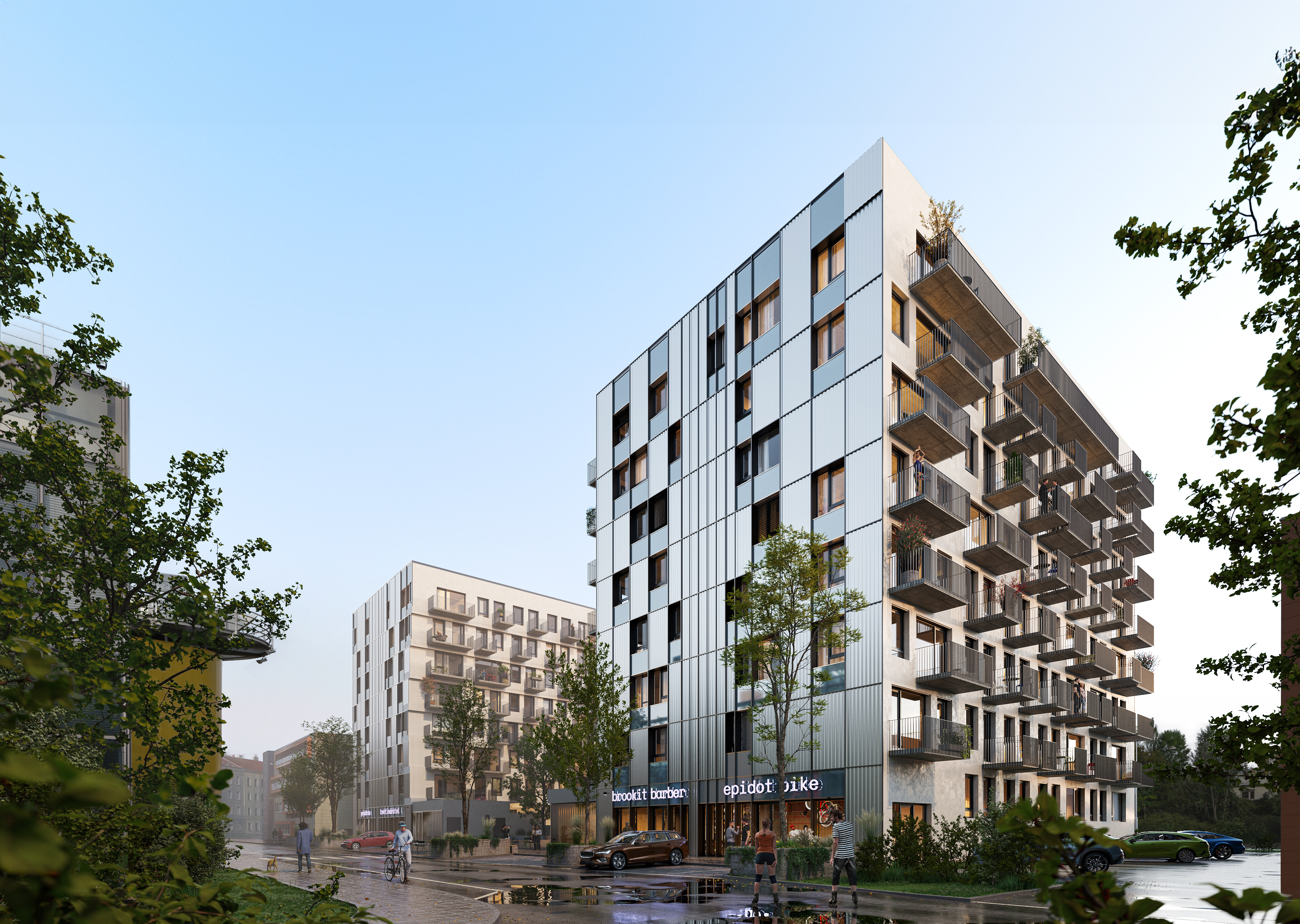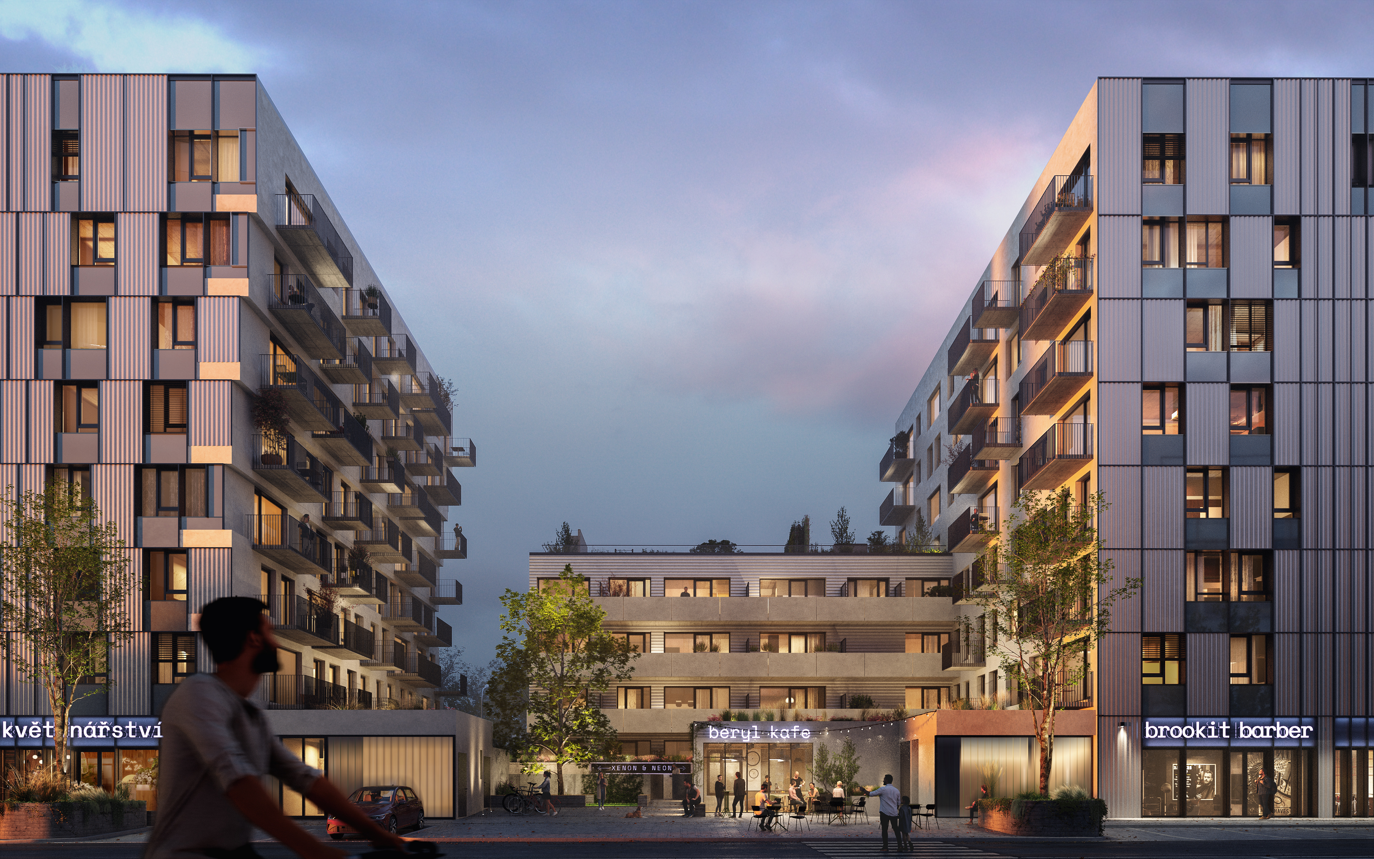 Architektonický návrh studia A8000 citlivě odkazuje na industriální minulost areálu a pracuje s promyšlenou kombinací materiálů – od plechových a skleněných panelů přes pohledový beton až po kontrastní bílé omítky. „Vycházeli jsme z klasického městského bloku, který jsme přizpůsobili specifikům lokality tak, aby reagoval na její minulost i budoucí potenciál,“ říká Anna Vršková ze studia A8000.