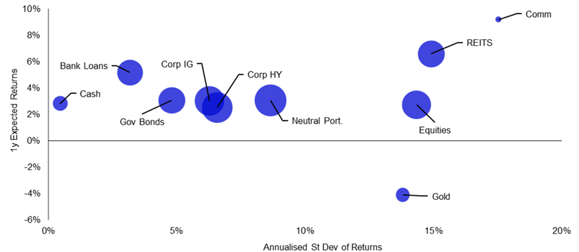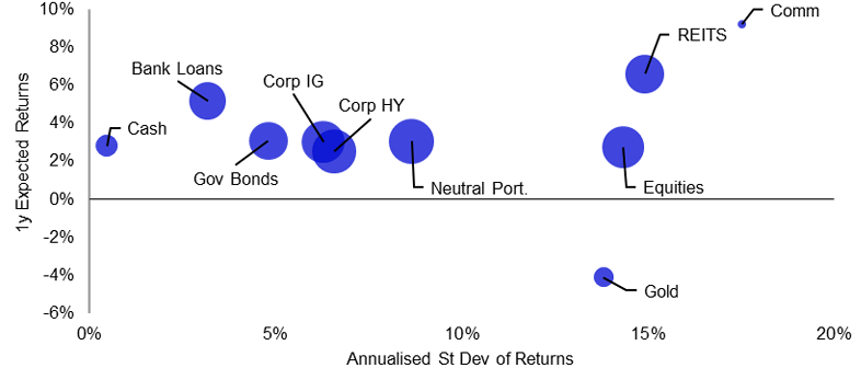 „Nejvyšší výnosy se očekávají u komodit, REITů a bankovních úvěrů, přičemž ty poslední mají výhodu nízké volatility, zatímco ty první mají nízkou korelaci s ostatními aktivy (korelace je úměrná velikosti bublin). Předpokládaný výnos akcií není nijak oslnivý, jsme opatrní vůči americkým akciím.