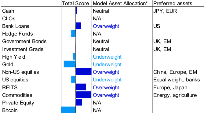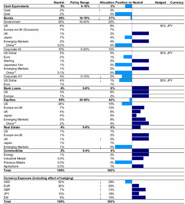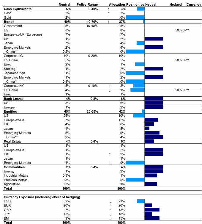 „Poukazuje to na opatrnost, která je vyjádřena preferencí bankovních úvěrů. Vzhledem k tomu, že očekáváme pokles úrokových sazeb a růst reálných mezd, což podpoří globální růst, stále upřednostňujeme riziková aktiva. To se odráží v maximální alokaci do komodit. To je třída aktiv, která podle nás přináší diverzifikaci (i když jsme my neinvestujeme nyní do zlata, které podle nás již značně profitovalo z geopolitického napětí). Nadváha u nemovitostí (REITS) také zvyšuje rizikovost (v rámci toho nadvažujeme ve Velké Británii a omezujeme váhu v rozvíjejících se trzích na nulu). Pokračující nadváha akcií mimo USA také přináší riziko a cykličnost, stejně jako preference Evropy a rozvíjejících se trhů (EM) ve všech kategoriích aktiv. Mezi měnami preferujeme japonský jen a částečně zajišťujeme americký dolar vůči japonskému jenu.