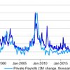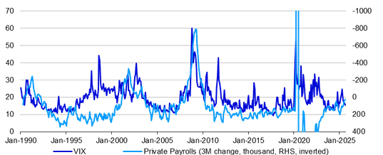 Trhy se chovají, jako by byl svět v pořádku. Geopolitická rizika však přetrvávají (Rusko/Ukrajina, Gaza, obchodní vztahy…) a americká ekonomika roste pomaleji než v loňském roce. Obrázek 4 ukazuje vztah mezi zaměstnaností v USA a indexem VIX. Podle našeho názoru je volatilita cyklickým jevem, takže pokud se americká ekonomika dále zpomalí, nepřekvapilo by nás zvýšení volatility (zejména v případě recese). Pokud by se růst zrychlil, očekávali bychom samozřejmě zvýšení ochoty podstupovat riziko, pokud by Fed mohl i nadále uvolňovat měnovou politiku.“