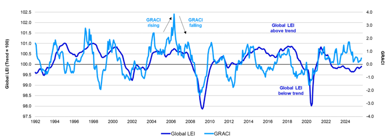 „Ekonomická dynamika se zlepšuje, navzdory obavám ohledně USA Obrázek 5 ukazuje dva vlastní ukazatele společnosti Invesco Solutions, které mají pomoci určit, kde se nacházíme v ekonomických a tržních cyklech. Ukazatel Global LEI (hlavní ekonomický ukazatel) naznačuje, že globální růst se zlepšuje (i když je pod trendem), zatímco ukazatel GRACI (ukazatel globálního cyklu ochoty podstupovat riziko) naznačuje, že ochota podstupovat riziko klesá.“