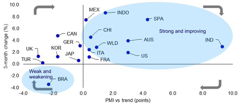 „Hodnoty indexu nákupních manažerů jsou lepší. Obrázek 6 ukazuje, že indexy PMI ve zpracovatelském průmyslu se v posledních měsících výrazně posunuly. Mnohé z nich se navíc nacházejí nad trendem. To naznačuje, že zpracovatelský průmysl se nachází v expanzivní fázi, což podle nás představuje dobrou zprávu pro celkový hospodářský cyklus (tedy výjimkou je Brazílie). Navzdory zjevnému oslabení americké ekonomiky se index jejích nákupních manažerů ve zpracovatelském průmyslu v posledních měsících zlepšil, i když je třeba poznamenat, že populárnější index ISM ve zpracovatelském průmyslu je od března pod hranicí 50. Zlepšení globální ekonomiky naznačují data PMI, což je přesně to, co bychom očekávali vzhledem k poklesu úrokových sazeb a růstu reálných mezd v mnoha zemích. Co nás znepokojuje je, že volatilita amerických cel a dalších amerických politik by mohla tlumit podnikatelské a spotřebitelské výdaje.“