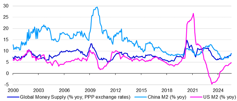 „Vzhledem k tomu, že mnoho centrálních bank je v tomto cyklu uvolňování měnové politiky napřed před Fedem, předpokládáme, že mnoho z nich se blíží ke konci uvolňování. Například Švýcarská národní banka již snížila svou cílovou sazbu na nulu a sazba vkladové facility ECB je 2,00 %, což je pokles z maxima 4,00 %. Pokrok ve snižování inflace je v jednotlivých zemích méně zřejmý a obrázek 8 ukazuje, že globální růst peněžní zásoby se zrychlil. To je to, co bychom očekávali, když centrální banky uvolňují měnovou politiku, a mohlo by to naznačovat zrychlení globální ekonomiky (což by podle nás bylo dobré pro cyklická aktiva). Může to však také naznačovat riziko následného zrychlení inflace. Proto se domníváme, že většina ostatních centrálních bank bude v příštích 12 měsících uvolňovat měnovou politiku mnohem méně než Fed, zatímco očekáváme, že BOJ bude pokračovat v postupném zpřísňování (viz prognózy na obrázku 9).“
