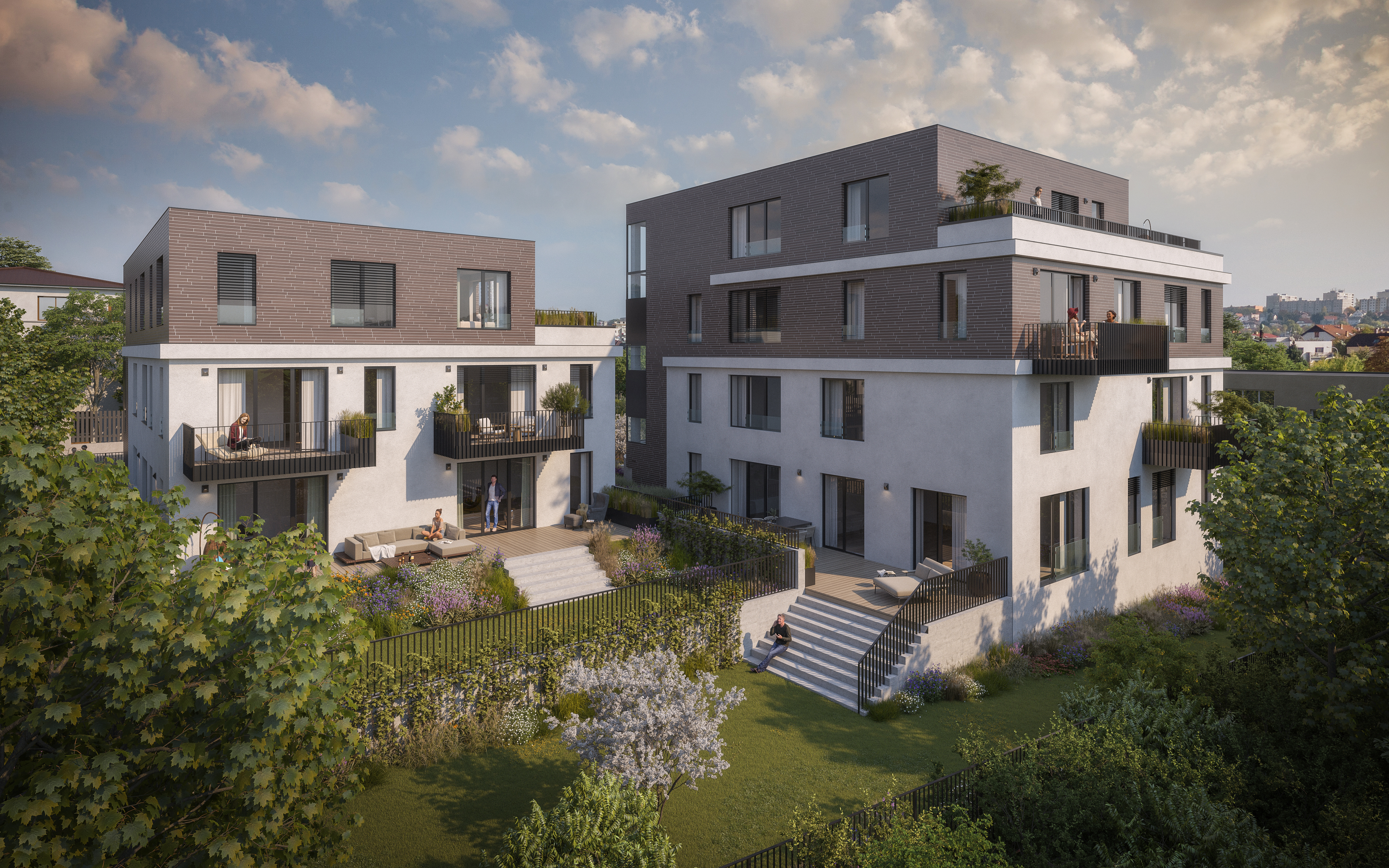 Celkové pojetí projektu pracuje s přírodními materiály, které podtrhují jeho rezidenční charakter a citlivě navazují na okolní vilovou zástavbu. Masivní dřevo je použito na terasách a balkonech, u velkoformátových oken i vyzdívaného oplocení. Přístupové chodníky jsou řešeny ze skládaného kamene a společné venkovní prostory doplňují rozmanité sadové úpravy.