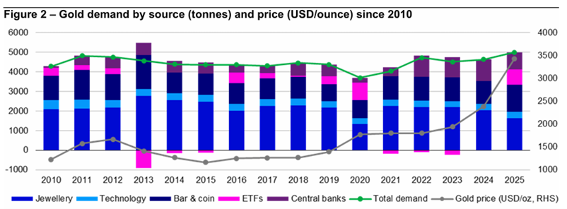 Vývoj na straně poptávky je ještě zřetelnější, jak ukazuje graf 2. Historicky největší složkou poptávky byly šperky. Ty však mají dostupné substituty, například stříbro, platinu či palladium, a jejich poptávka od roku 2022 v reakci na růst cen klesá. Po poklesu o 8 % v roce 2024 se poptávka po špercích v roce 2025 snížila o dalších 19 %. Vzhledem k prudkému růstu ceny zlata na začátku roku 2026 lze očekávat, že tento trend bude pokračovat i letos, pokud se ceny udrží na současných úrovních.