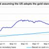 Ještě zajímavější výsledek přináší jednoduchý model „zlatého standardu“, který odhaduje cenu, při níž by oficiální zlaté rezervy USA plně kryly objem amerických bankovek a mincí v oběhu. K prosinci 2025 tento model implikoval cenu přibližně 9 300 USD za unci (viz graf 1).